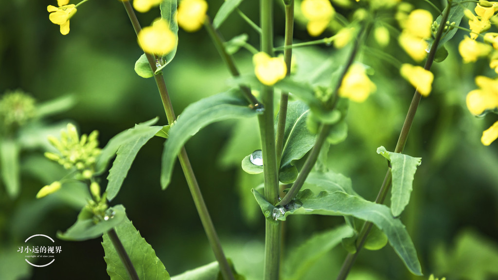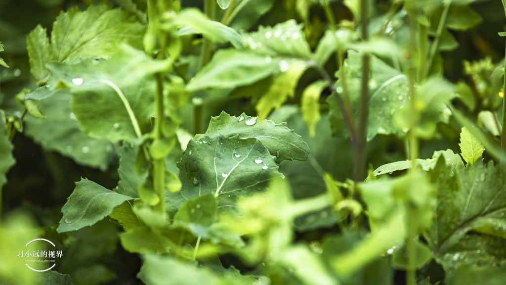 叶浅黄:油菜花的叶子在雨里承载着一颗颗晶莹的水珠泛着光