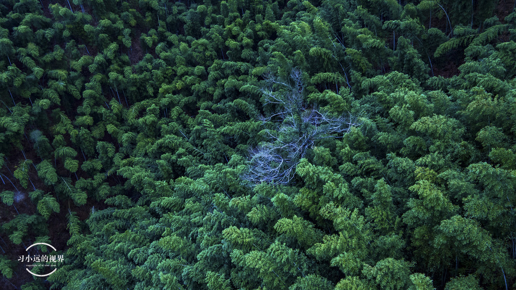 此外,我还发现这里的竹海真的很特别,无人机凑近看,一片绿色的海洋之中会有那么几棵掉光叶子的枯树,看起来非常的特别。