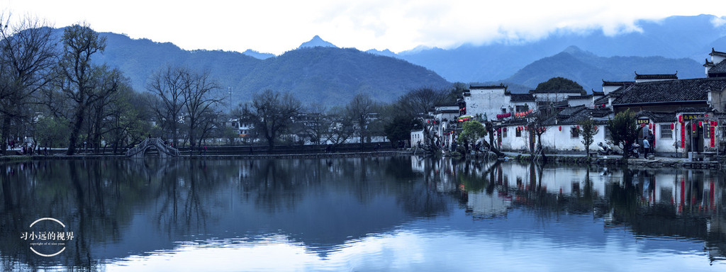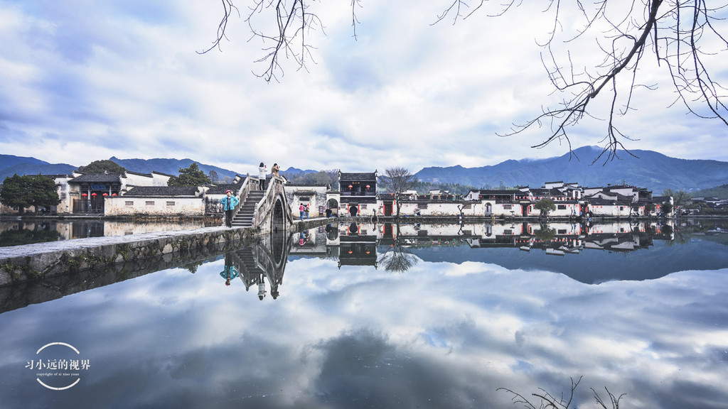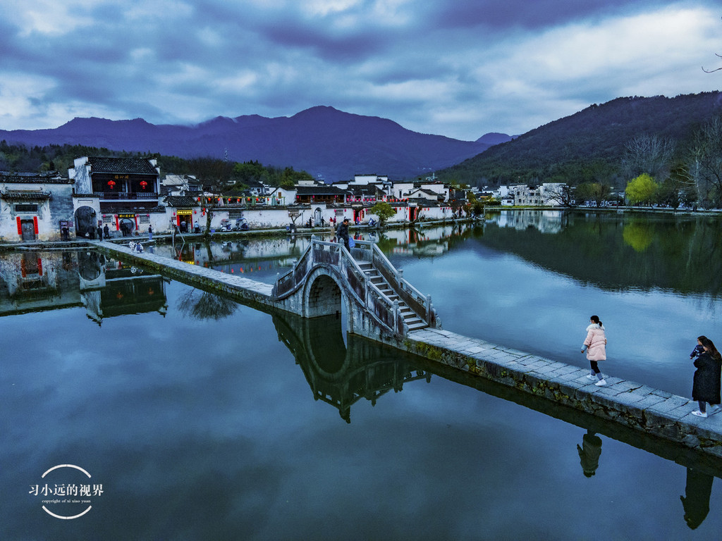 傍晚时候的宏村,游客还是络绎不绝,画桥上来来往往的游客述说着这里的热闹,平静的南湖水面倒映着来往的人影,从桥上走过像是人在画中行走。
