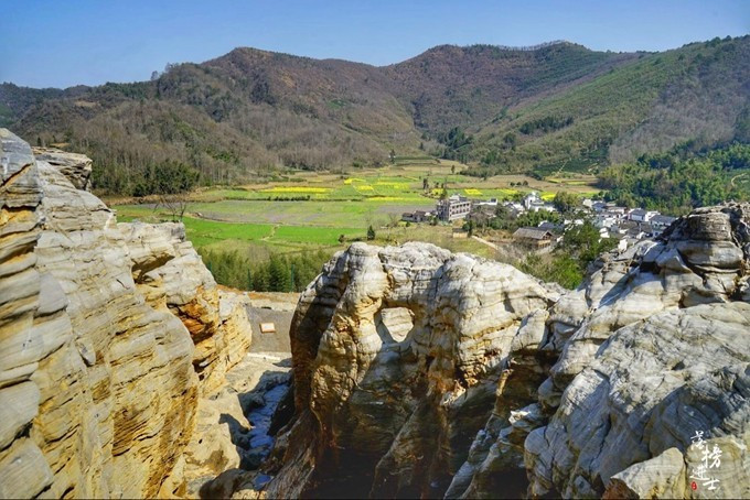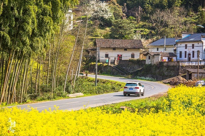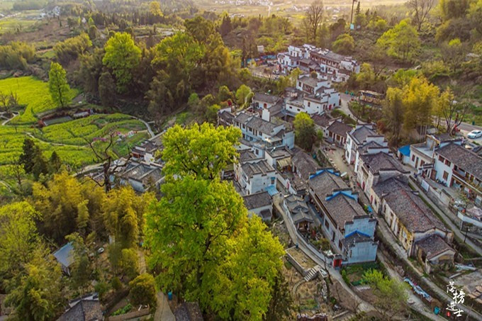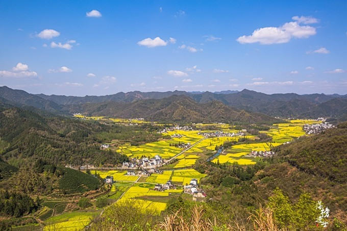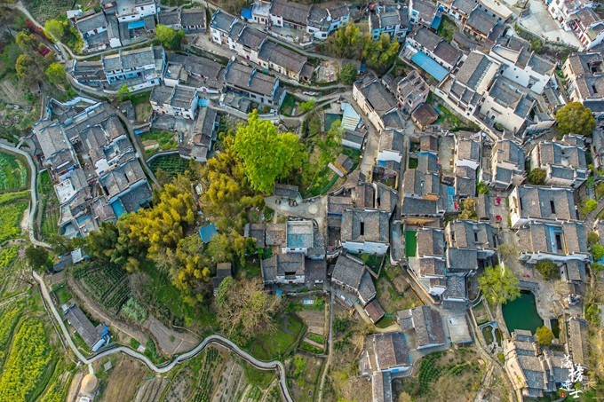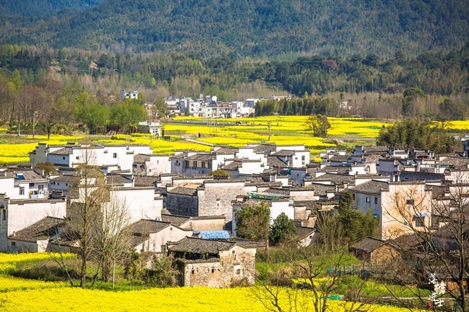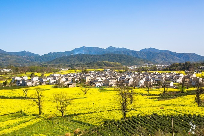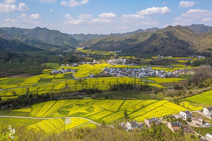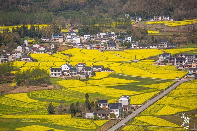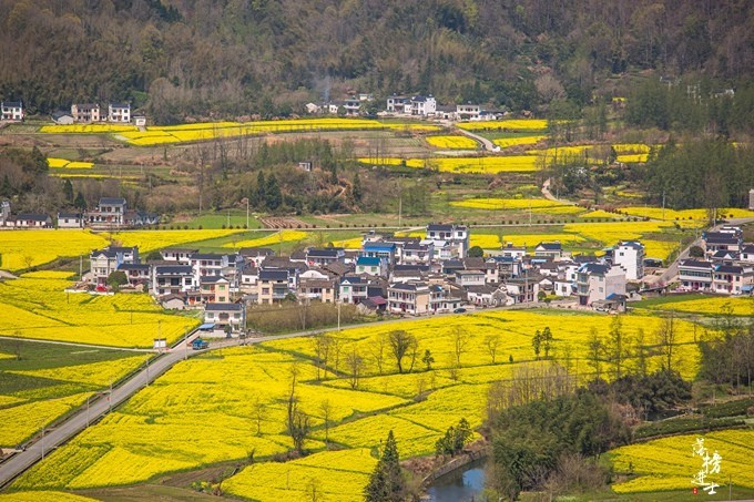仲春时节,油菜花盛放,站在高处往下俯瞰,一片片油菜花田阡陌纵横、错落有致,粉墙黛瓦的徽派古民居点缀其中,让一片自然美景中增加了许多生动的烟火气息。