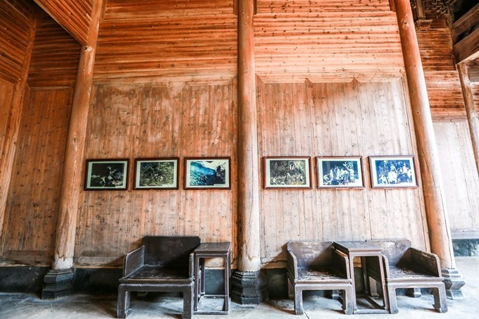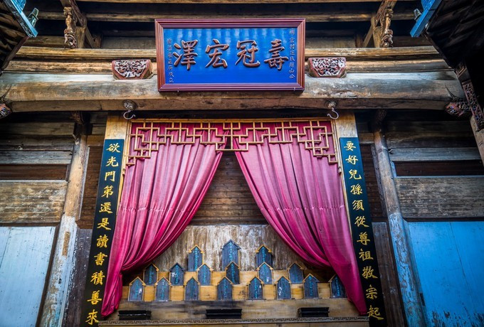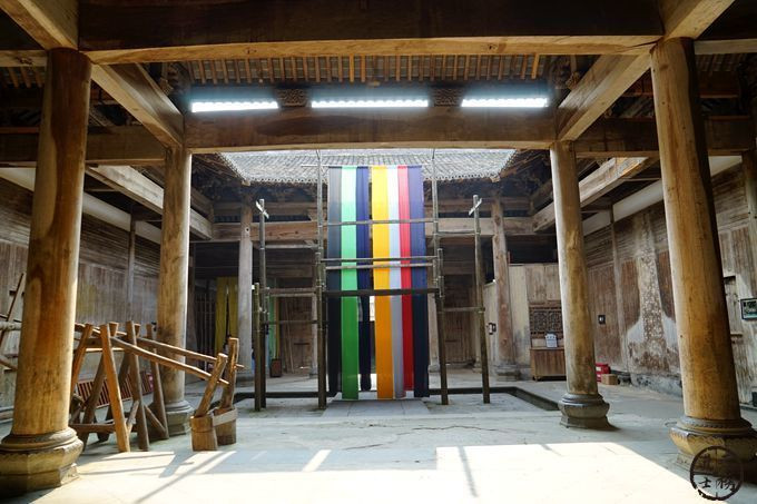 《菊豆》中的老杨家染坊位于南屏村叶氏宗祠。当年《菊豆》的拍摄这里也保留了电影中的一些痕迹,进入大门内54根硕大挺拔的木柱映于眼前,“西州声教流岚谷、南国簪缨嗣 石林 ”等充满了寓意的木制对联还挂在上边。接着向前走,染池、染布、台架、挂车等熟悉的元素悉数出现,电影中的悲怆又多了一分,菊豆和杨天青窒息般残酷和压抑的爱情就是在这里诞生。看着眼前高高悬挂的染布,仿佛正是束缚俩人情感的牢笼,可恨却又无奈。