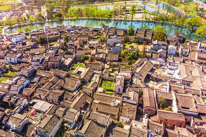 偌大的一个村落,密密地排列着青瓦白墙的民居,即使只是远远俯瞰,也能感受到人们在其中生活的气息。春天吹过村庄,鲜花盛放,草木发芽,整个村子都是生机盎然的模样。
