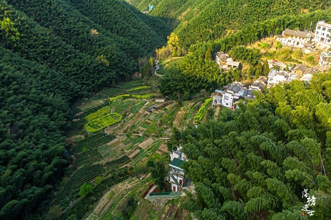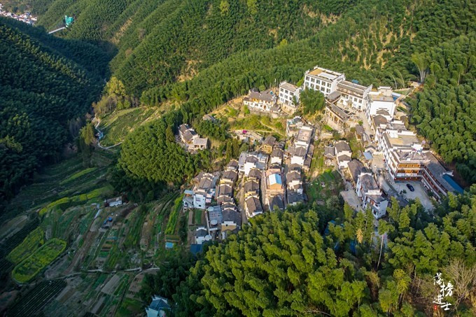 航拍可以看到竹海全景,阳光将整座山描绘得明暗交错,极有画面感。大片大片的竹林覆满了整个山,一片白墙灰瓦的房舍被其包围,真有误入世外 桃源 之感。