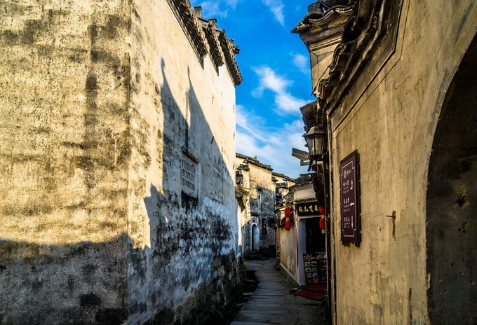 这条路非常美,粉墙黛瓦的徽派建筑与色彩斑斓的植被交织在一起,就像是一副调色浓郁的油画。