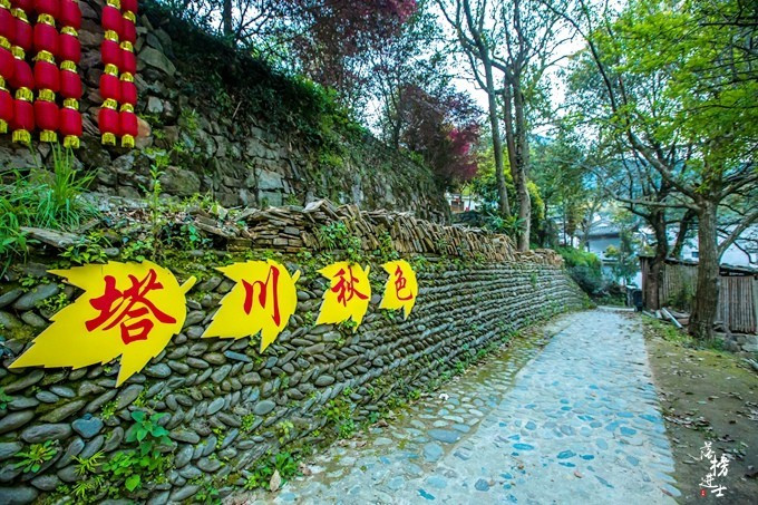 塔川 的秋色已经成为村中旅游的招牌,刚进村口,便看到了以树叶形状做底,“ 塔川 秋色”四个醒目的大字。