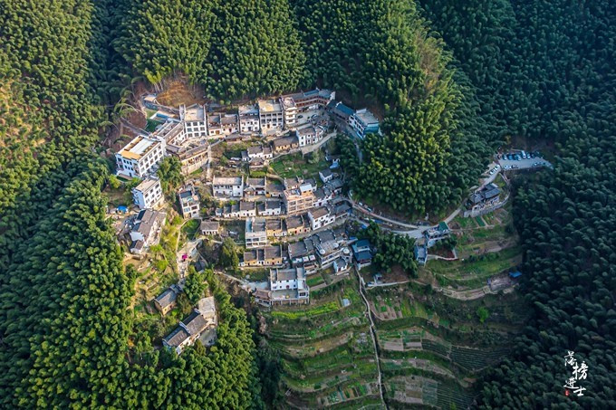房舍之下的梯田错落有致,绿竹芊芊,房舍俨然,阡陌纵横,尽收眼底。