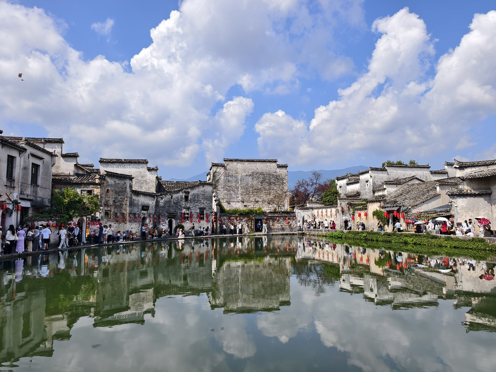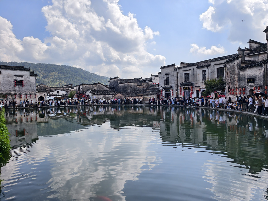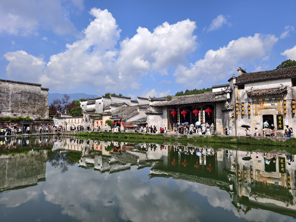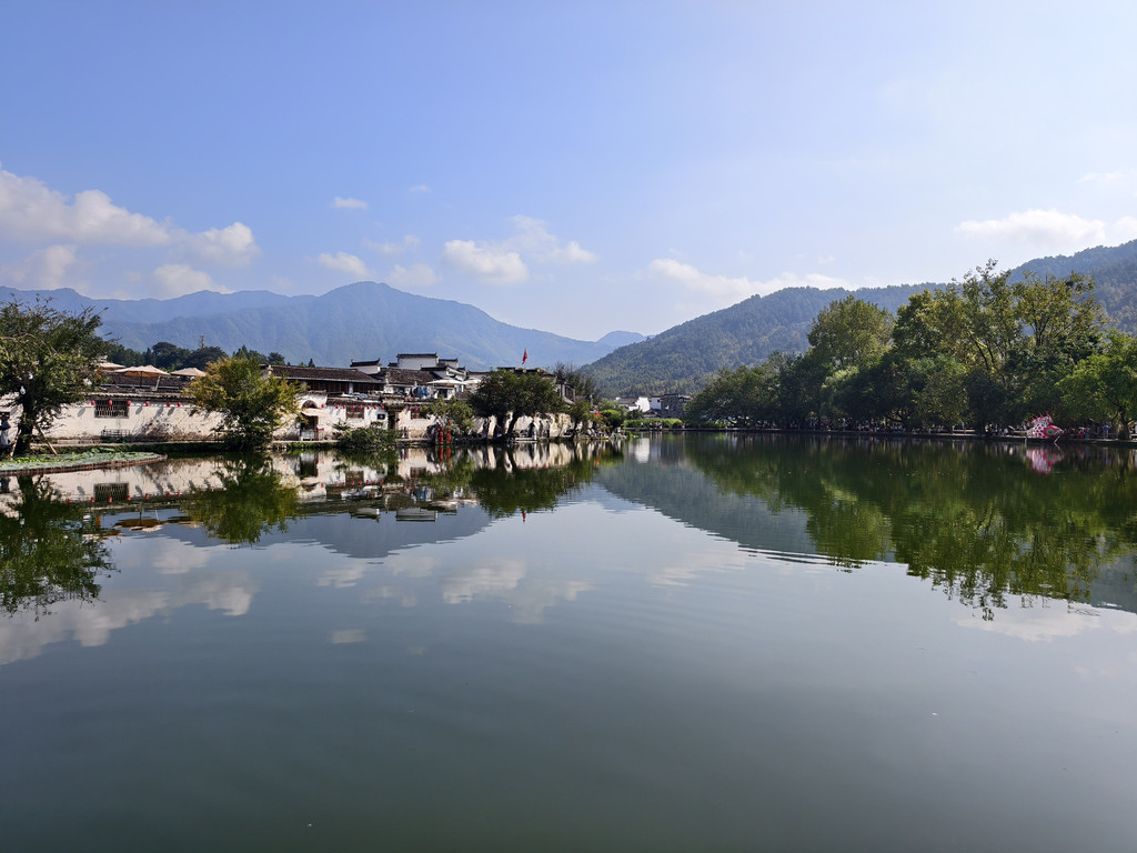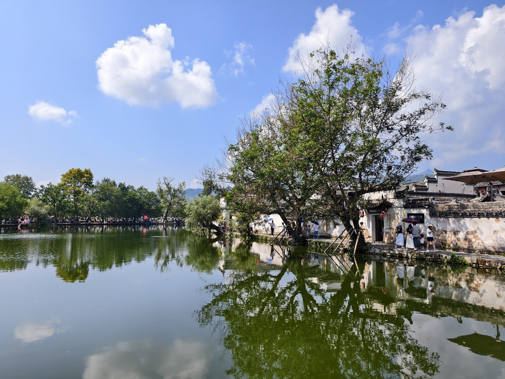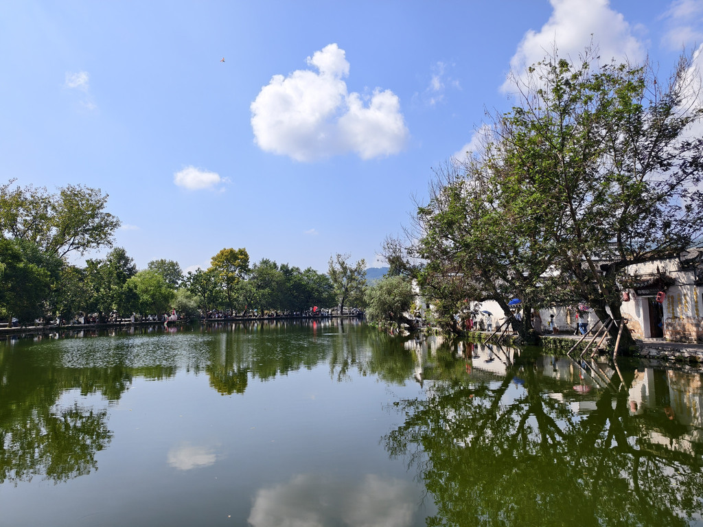 月沼建于明永乐年间(公元1403年--1424年),塘沼四周青石铺展,粉墙青瓦整齐有序分列四旁,蓝天白云倒影水中,宏村画面有一半来自月沼。