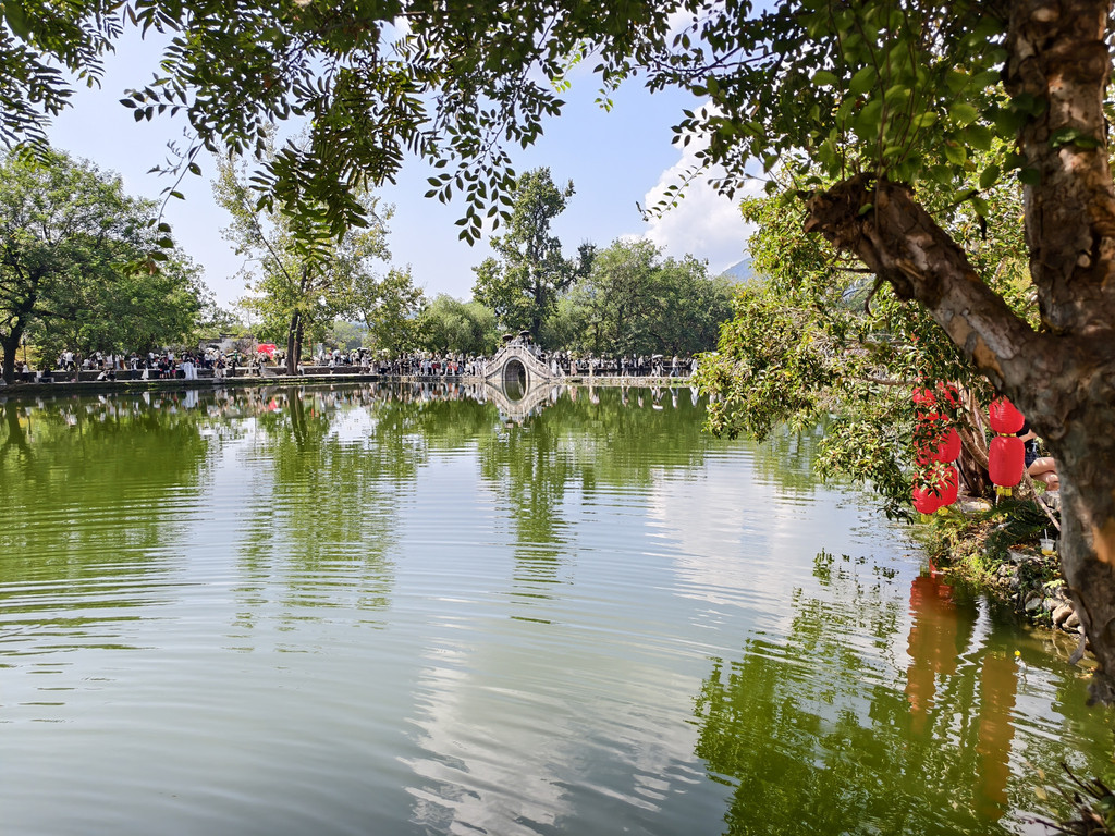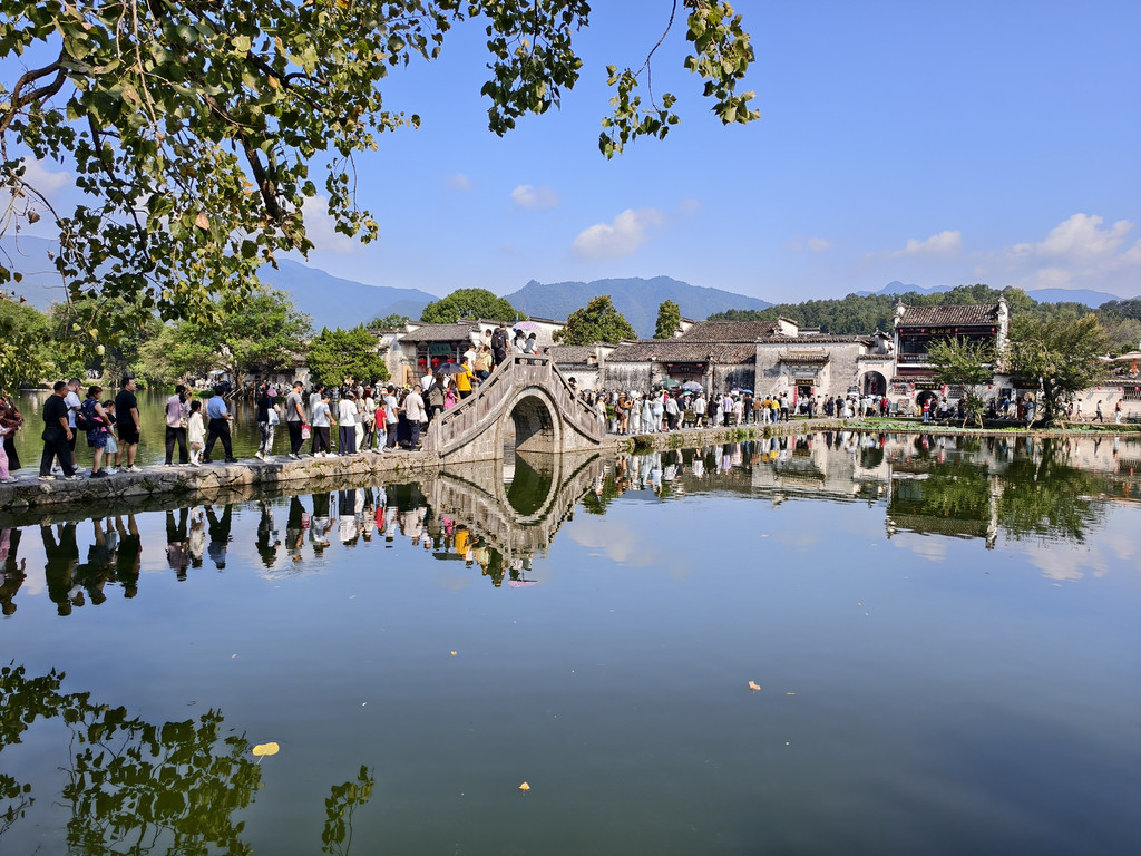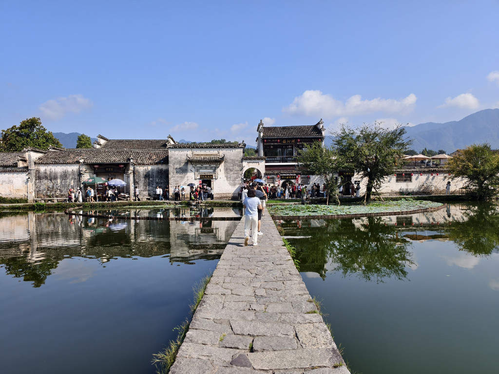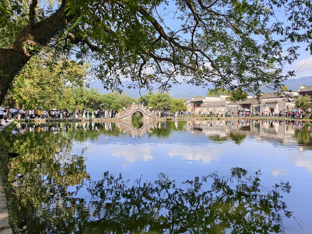 来到南湖南岸,看到宏村标志性的长堤和石拱桥,堤桥上游客络绎不绝。