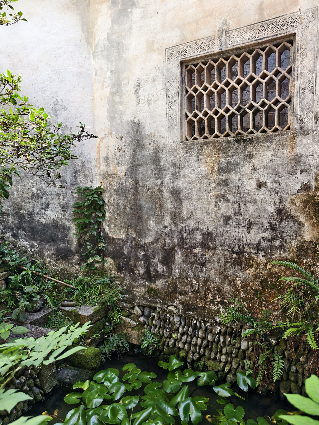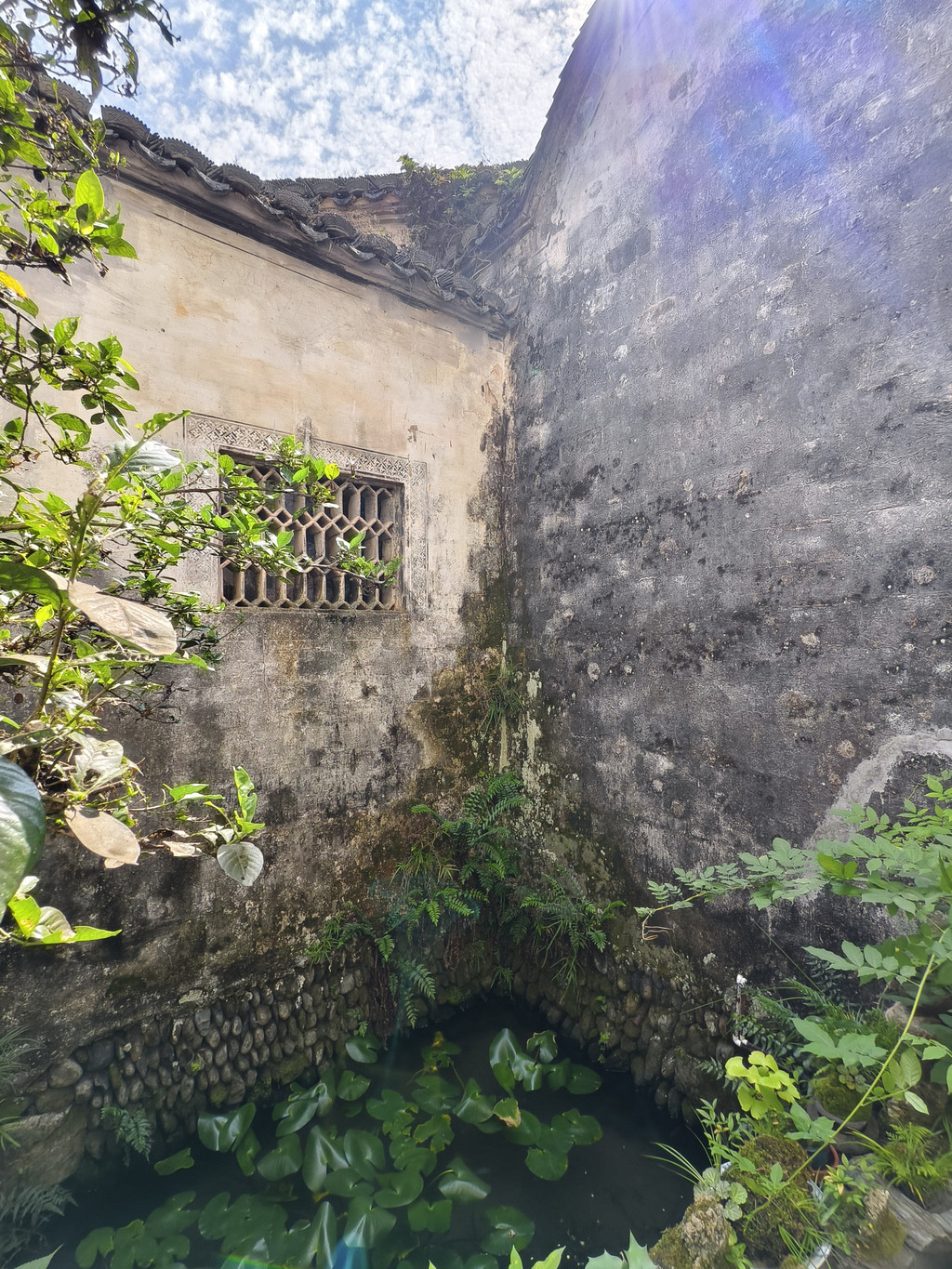厅堂东边利用有限空地,建一小水塘,活水长流。