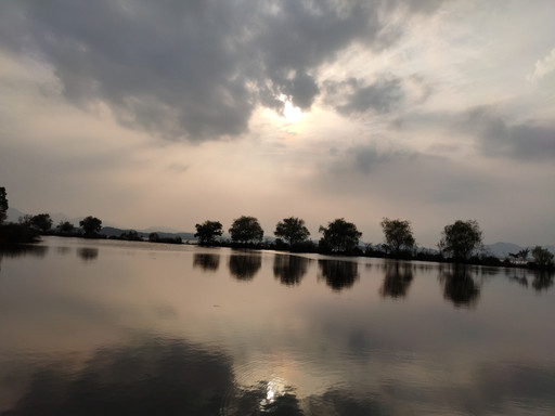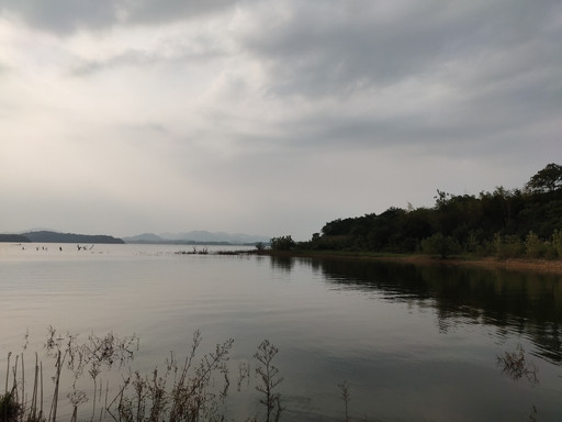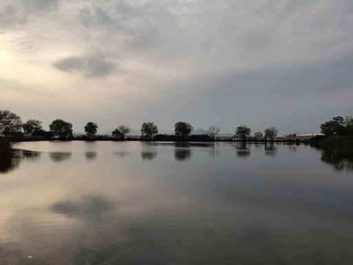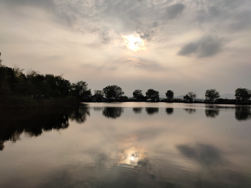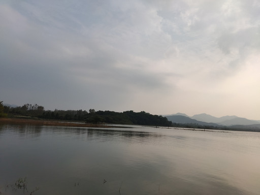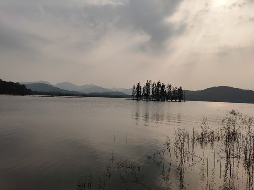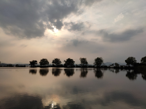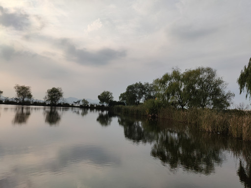 夕阳渐渐隐没,收起了漫天的光影,天色渐渐地暗了下去,云湖再度褪去了艳色。暮色四合,大山拥抱着的云湖再度沉寂了下来,恬静而安详。掠过水面的鸥鹭留下一抹轻影,自归巢去,我们也到了踏上返程的时间。