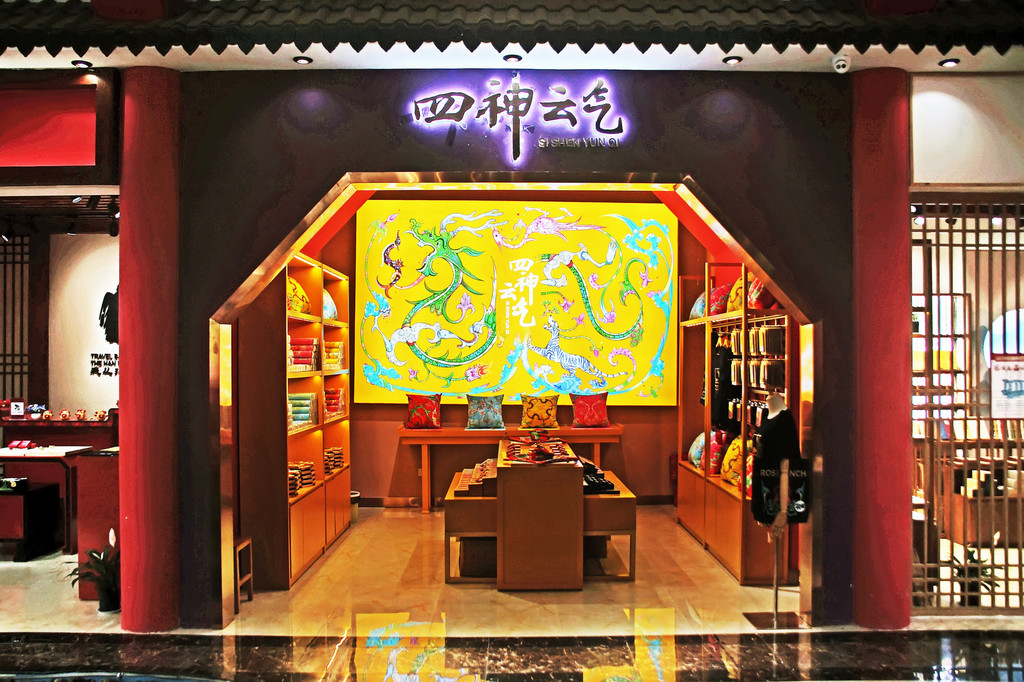店内的四神云气设计图就是根据出土的壁画重新修复改良设计的,飘逸流动的视觉和传统的配色让人移不开眼....