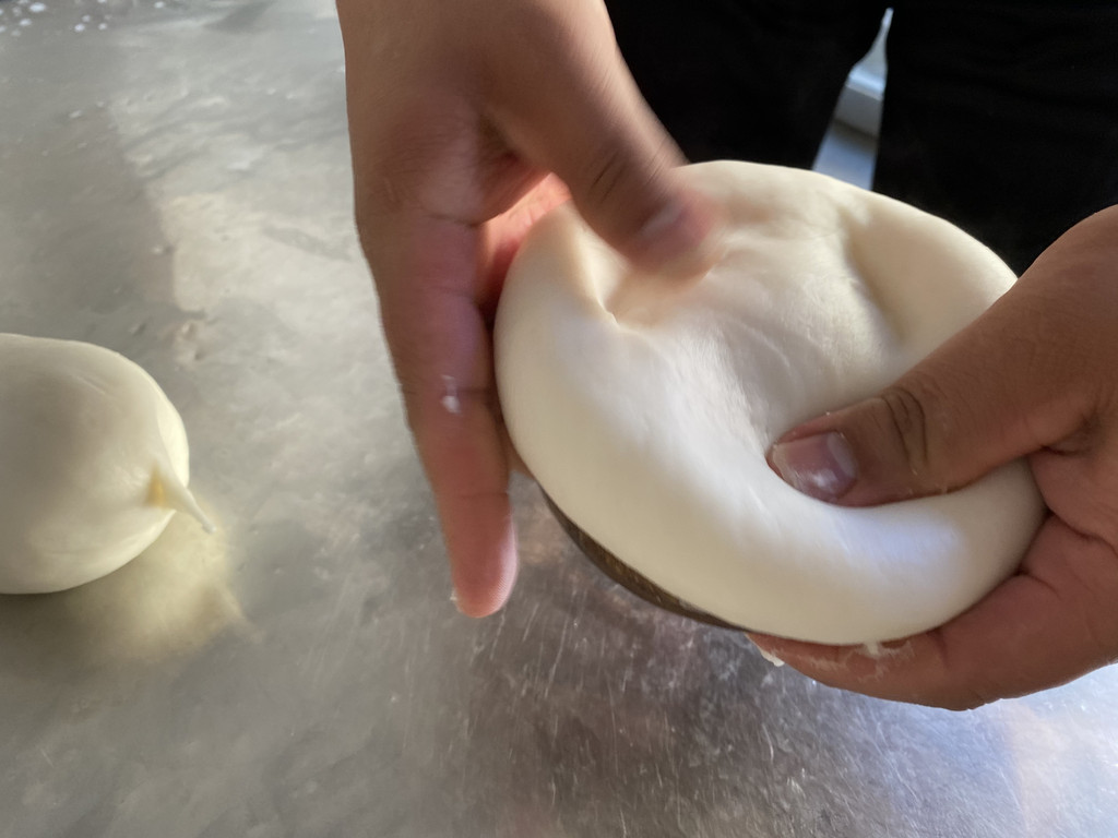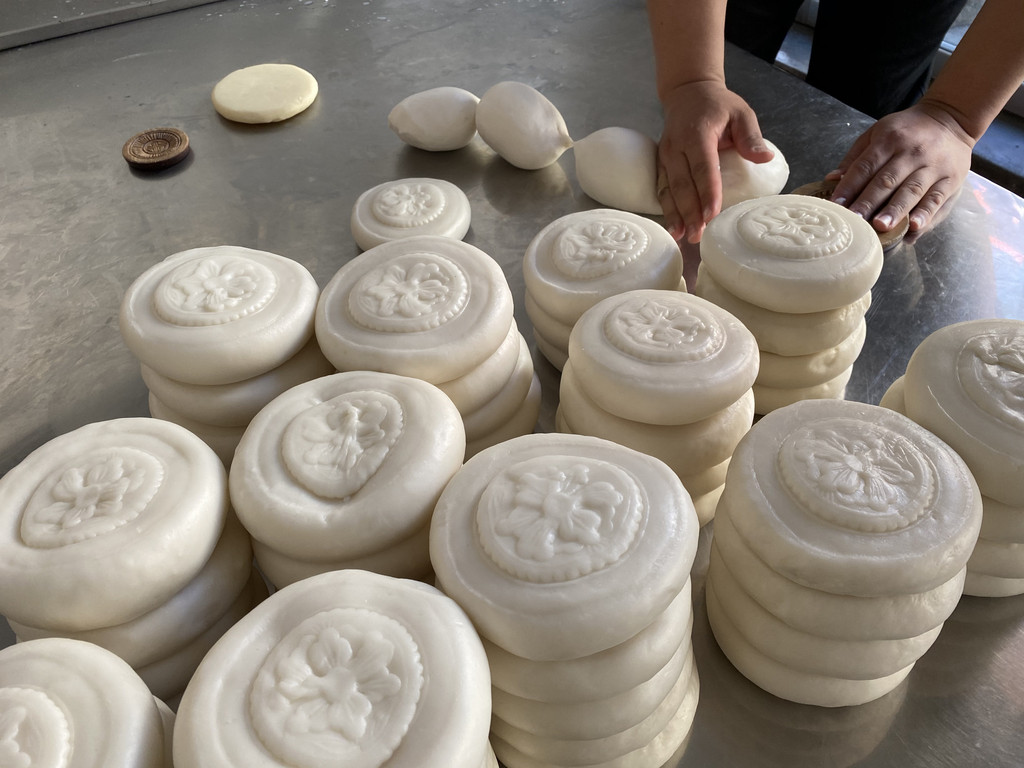 一都白粿一般选用粘性好的上等冬米,洗净浸透,放到蒸笼里蒸透,然后倒进石臼舂,每臼要舂数千下,直至饭粒全都匀化,取出捏成富有韧性而不粘手的圆球状,再用雕花的圆形模印压成为一个个形如圆月的白粿,上呈现出牡丹或缠枝花等花样。