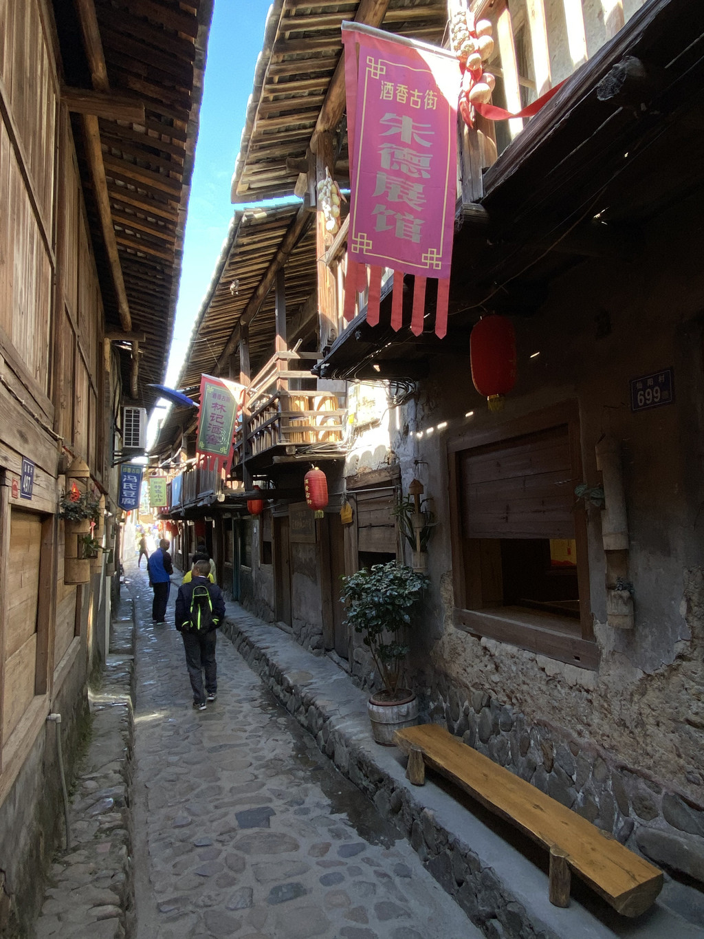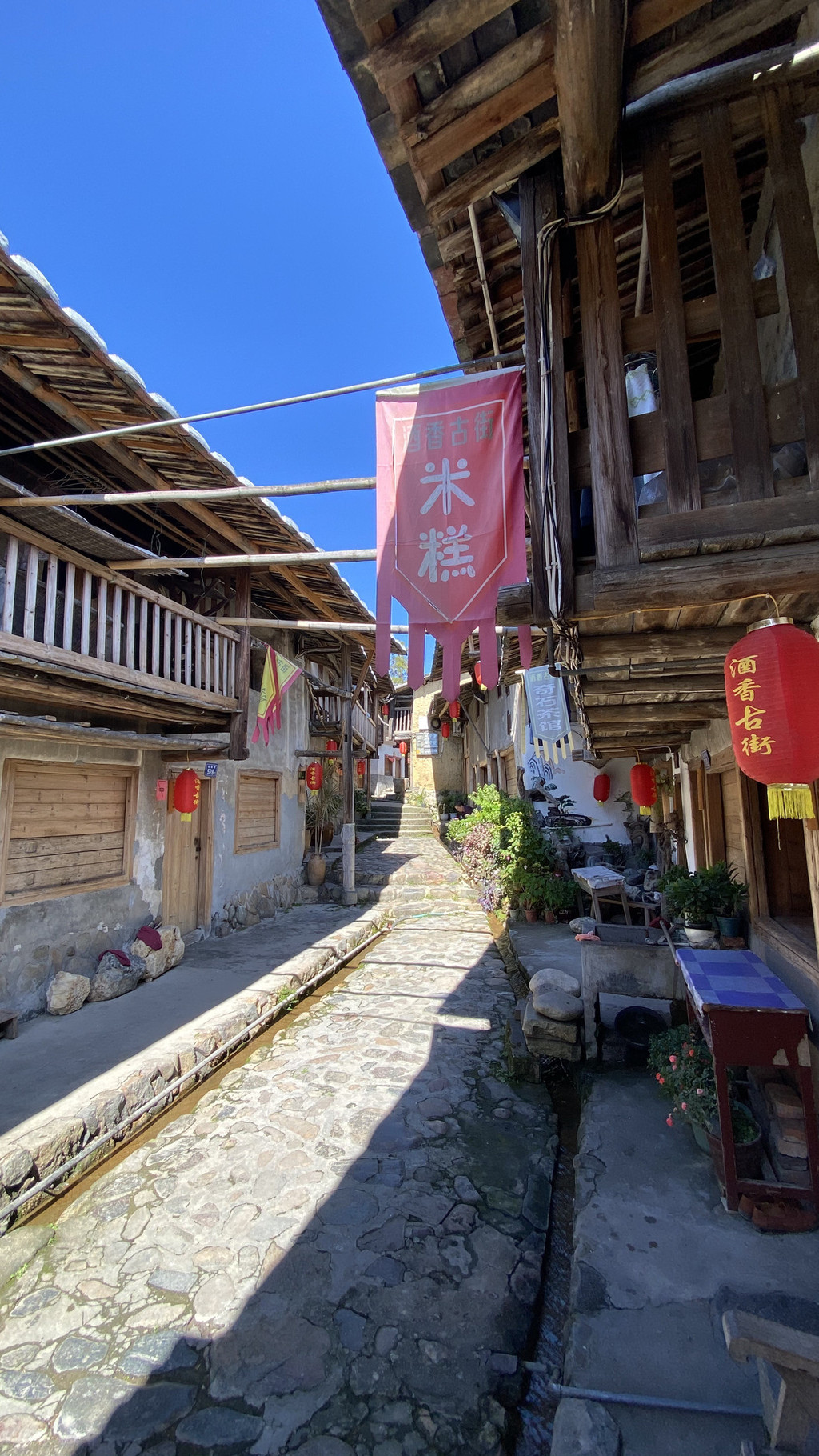 楼房上插着各种商店的招牌旗子,每户楼的立面都有一个窗口,透过窗口你可以看见这户人家在酿酒、这户人家在做饭、那户人家里孩子们在写作业……不同的窗,不同的人,不同的生活,为这条古街增添了许多市井生活气。