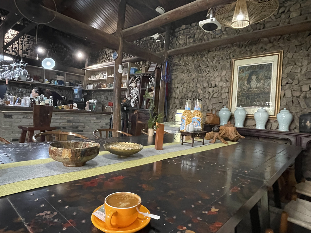 饭后来到猪栏咖啡,从窄小的门、石头垒砌的墙和木梁,大概还能看出一点曾经猪栏的影子。但现在的咖啡馆布置的井井有条,充满了浓郁的怀旧感,让人感觉在这里喝的不止是咖啡,还是情怀。