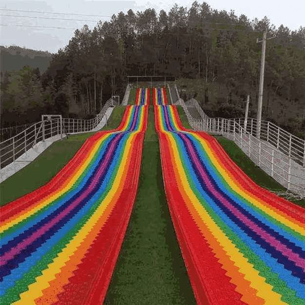 【悬崖彩虹滑道】色彩绚丽的滑道像一道彩虹挂在高处,超长的滑梯仿佛从天际蔓延下来。坐在滑板上既可体验拥抱大自然的快乐,也可以让大家在一年四季里享受滑行的乐趣。又刺激又解压,此处可以大朋友、小朋友一起来体验哦。