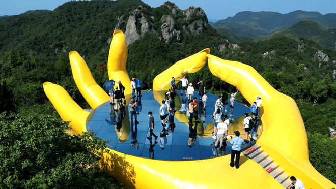 【佛手天空之镜】五指岩景区佛手平台的手臂的长度15.8米、最宽处宽度7.6米、面积为175平方米,手掌的最长处长度12.8,玻璃平台的面积为99平方米,通过了扛旗世界纪录认证,成为世界上最大的佛手平台,成功创下了“世界上最大的佛手平台”记录!