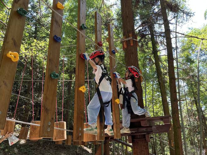 【丛林穿越】丛林穿越项目利用自然环境在树木、山水之间设置吊桥、丛林索道、空中飞人等体验高空坠落和自由滑翔的快感。