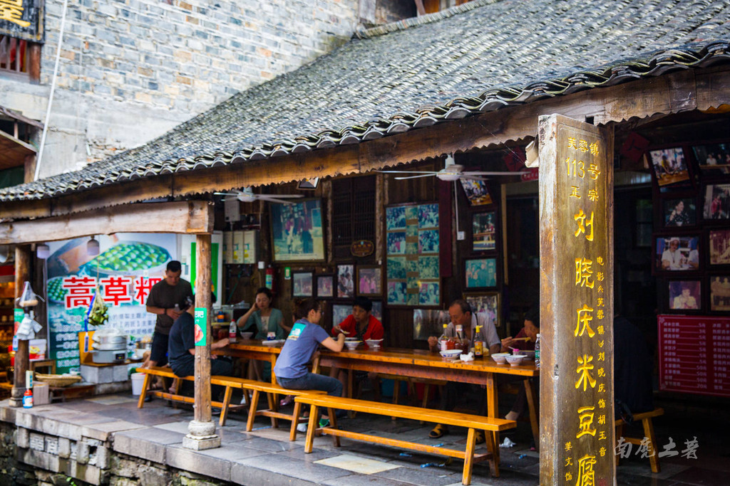 古街到贞节牌坊的位置,便是刘晓庆米豆腐店,电影《芙蓉镇》的米豆腐场景地, 芙蓉镇的米豆腐是混合着油盐酱醋辣的家常小吃,有咸的,也有甜的,刚好坐下来作早餐吃。店铺的墙上挂满了电影里的剧照,看过电影的人容易被带入电影场景里。