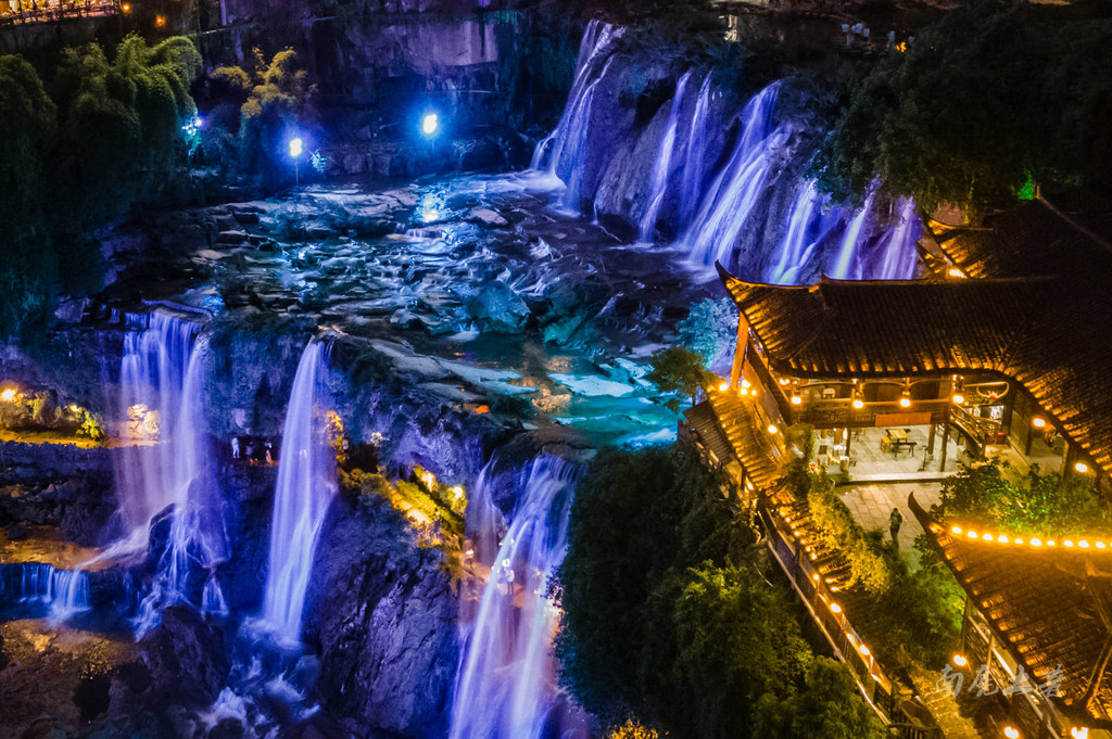 终于明白,很多人说到芙蓉镇一定要住一晚,看这夜色中的光影变幻的彩色瀑布,美轮美奂。