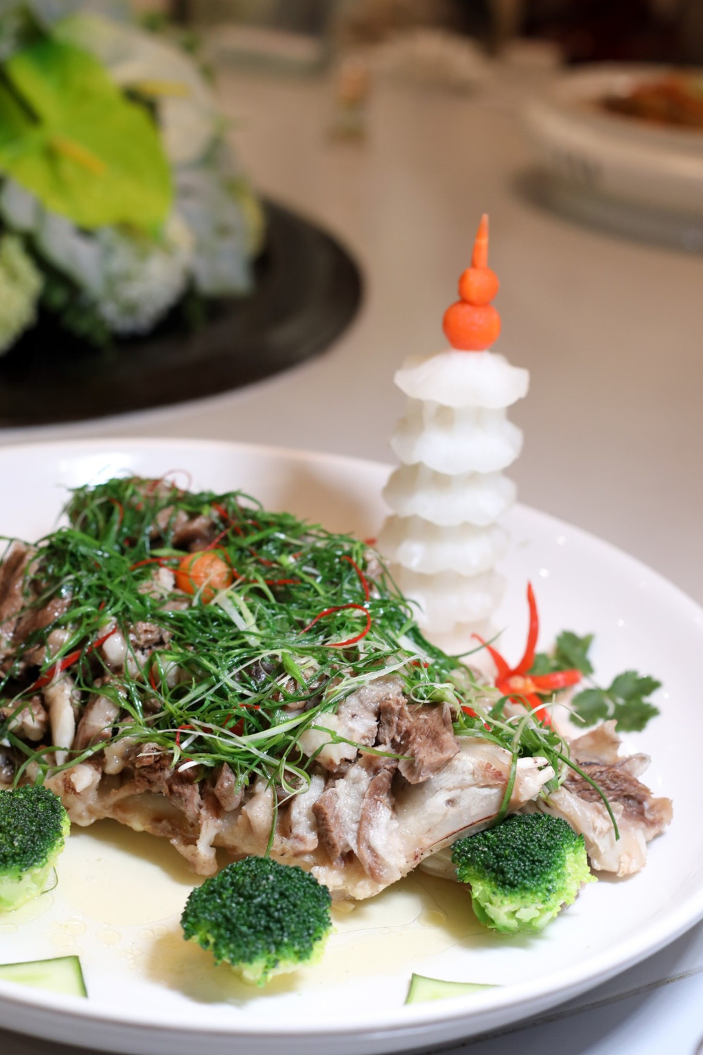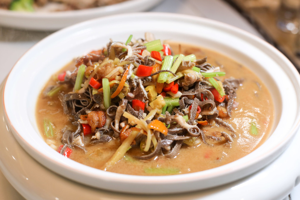 猪脸肉 猪脸部分肉质紧致嫩滑,切片后加入葱蒸熟,葱香渗入到肉中,简简单单的烹饪已是极好的美味。