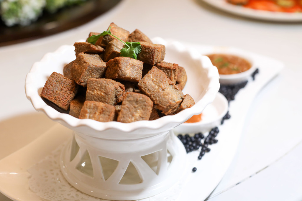 炸豆腐 本来以为豆腐不过是平平无奇,没想到这道炸豆腐却是让我非常惊喜。黑豆豆腐香味浓郁,炸过后外皮香脆,内里嫩滑,入口丰富的层次感最是迷人。