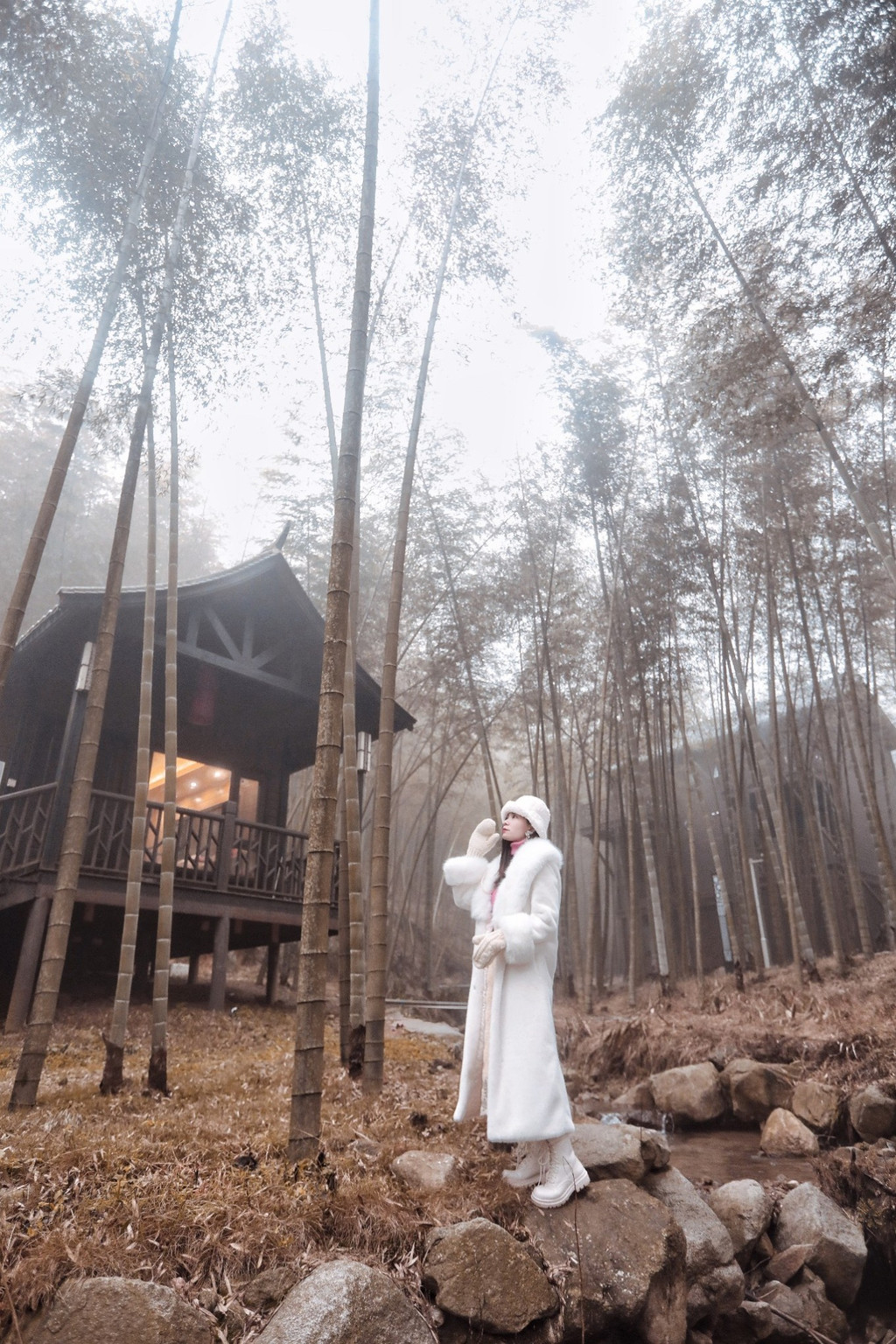 走在竹林中,还有潺潺流水,构造出一幅宁静而安详的水墨画。