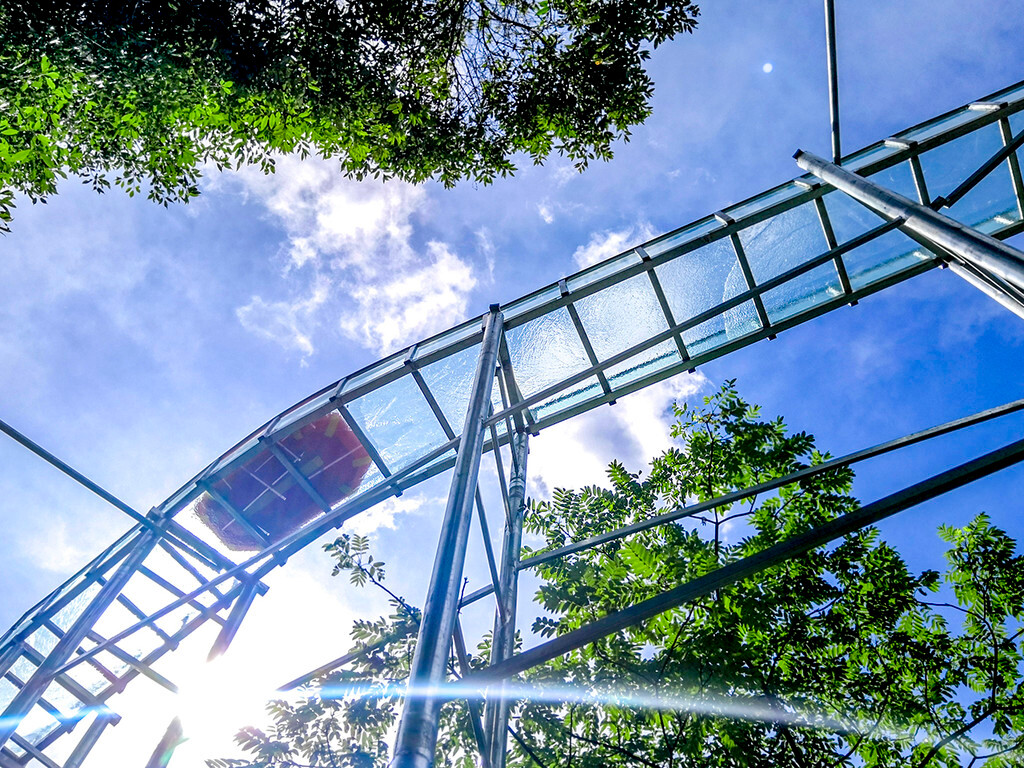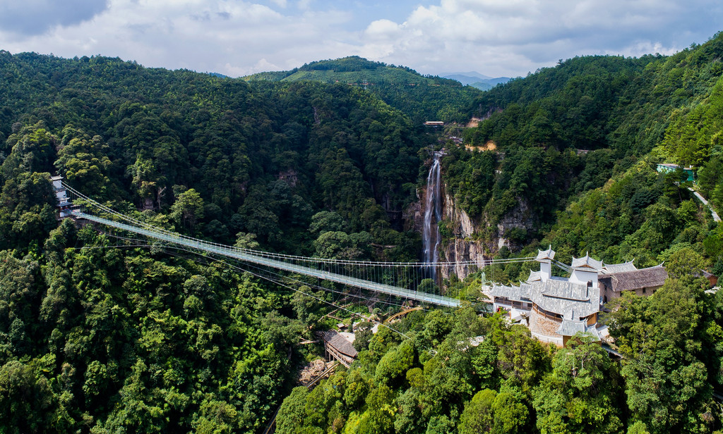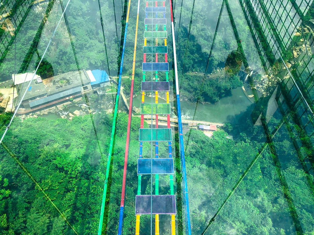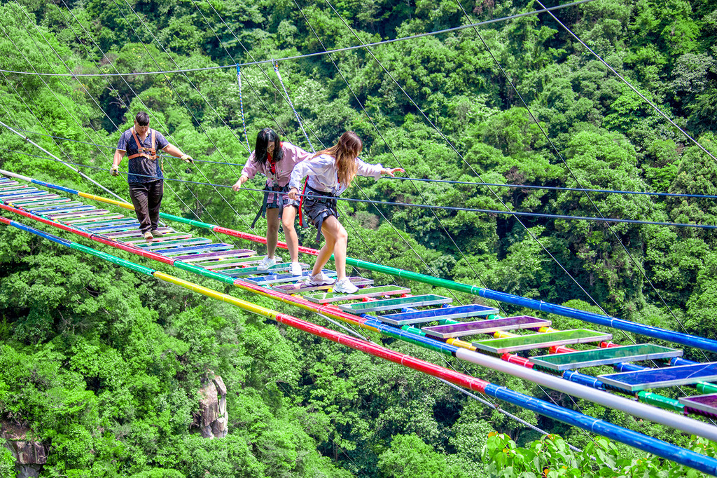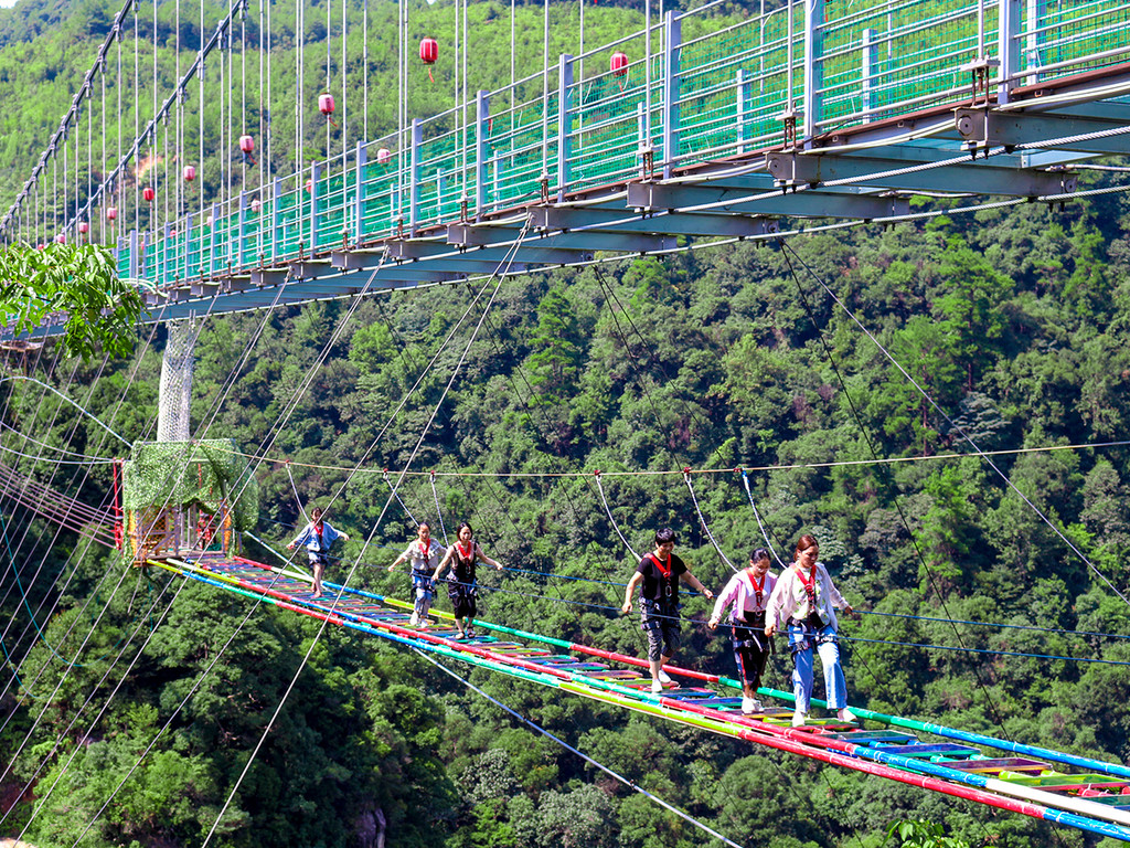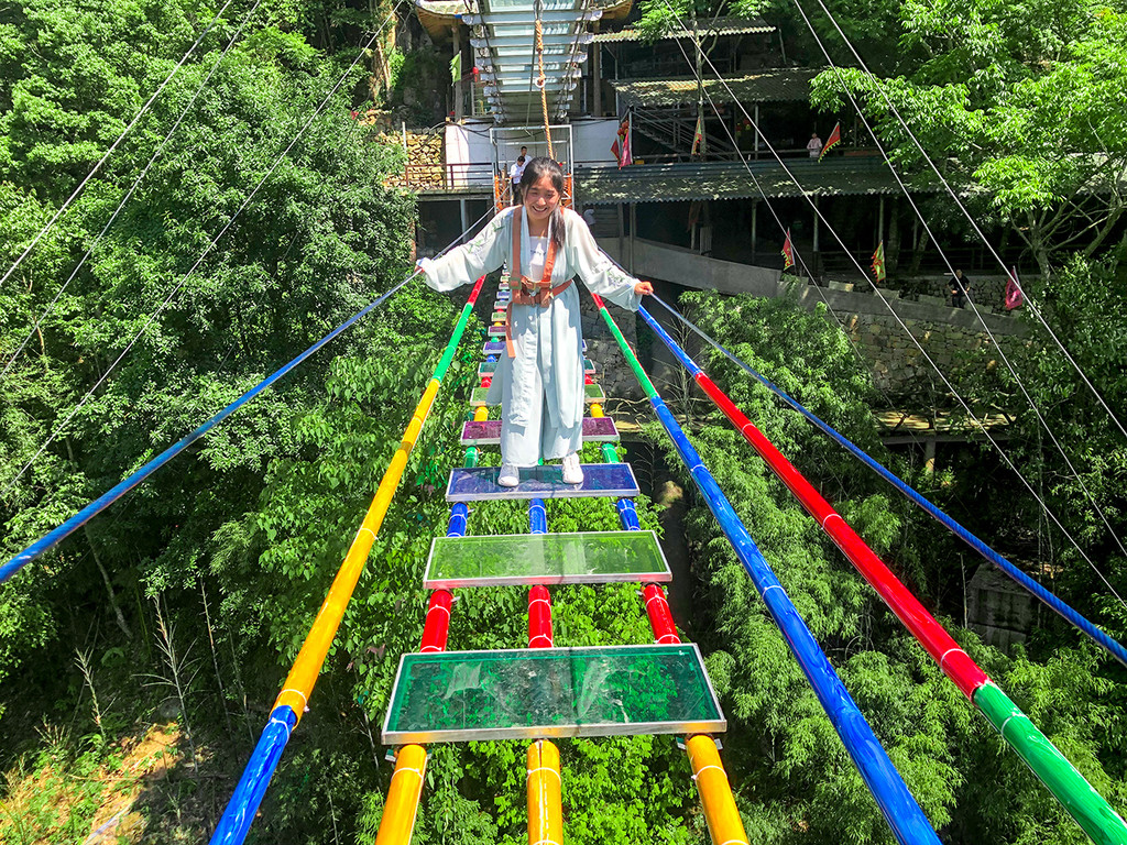 位于高洲溪两岸峡谷之间,也是华东第一座玻璃天桥两峰崖壁陡直,侧边是老鹰崖瀑布,玻璃天桥长248米,高146米。除了全透明玻璃构造。站在玻璃天桥上如同悬空于万丈深渊之上,透过玻璃还可看到绿林武林大会广场、桃坪古寨、剑客山庄等美景与侠客比武论剑的精彩场面。