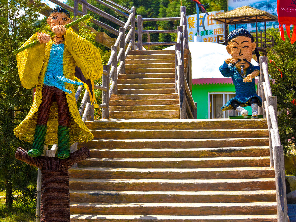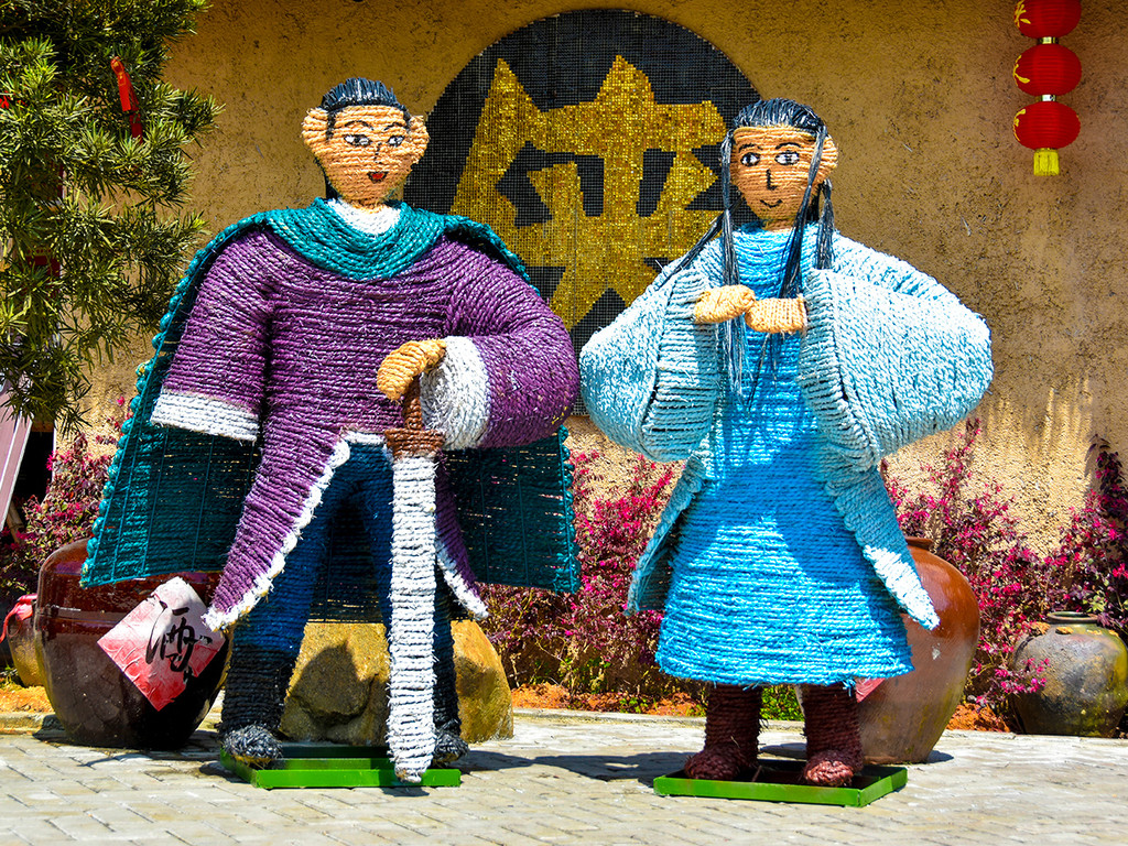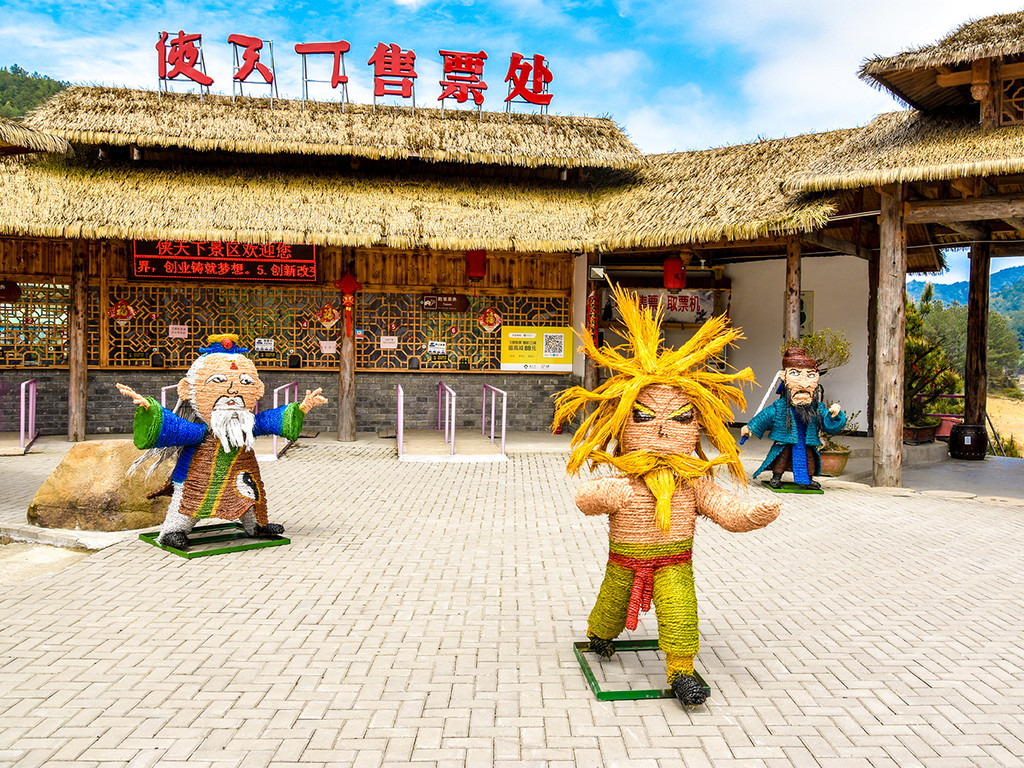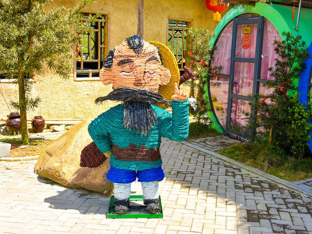 整个景区萦绕着一股武侠情谊,站立在景区内的雕塑,是金庸小说《天龙八部》里武功极高的高僧还有功夫熊猫阿宝、《水浒传》中的李逵等等
