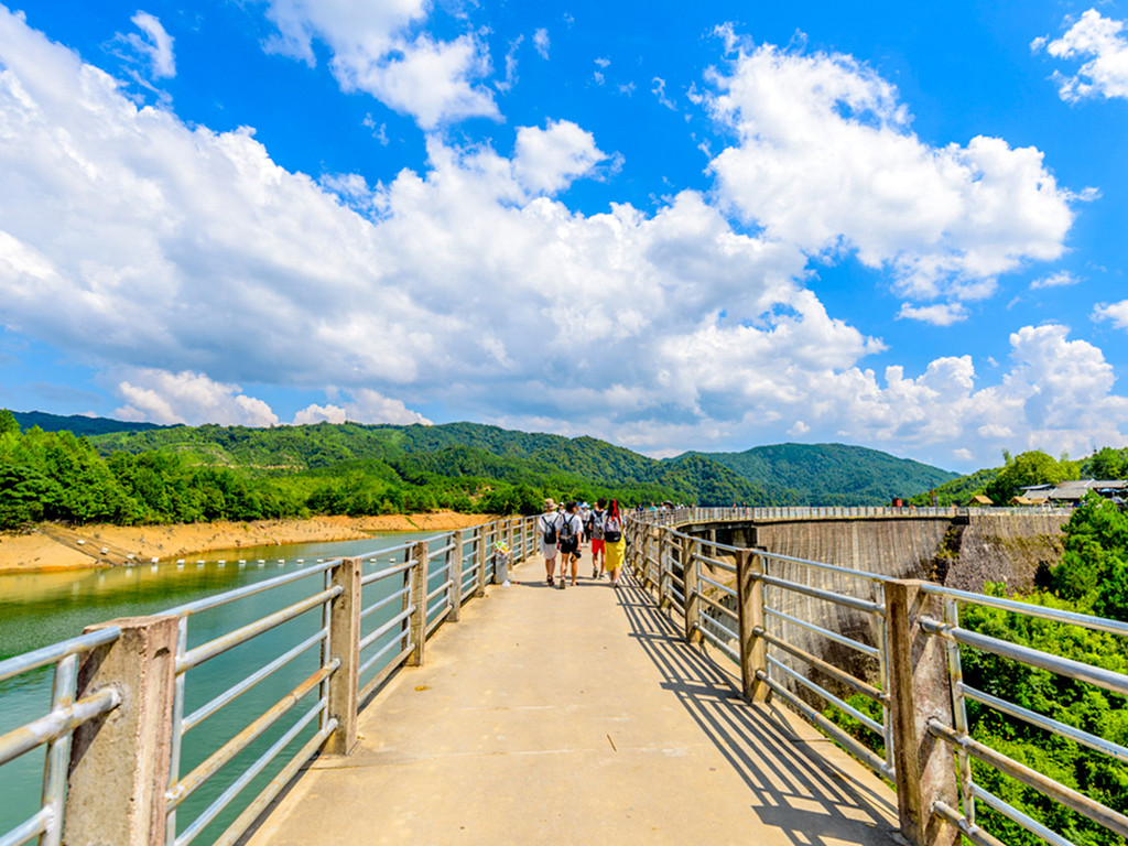 过大坝就到侠谷景区,走过峡谷景区就到绿林景区全程大概3—4个小时,这个大坝始建于上世纪五六十年代,全长38米,高68米,属于双曲式的电站大坝,从任何一个角度看都是弧形的,这也是大坝建造技艺中最高超的一种
