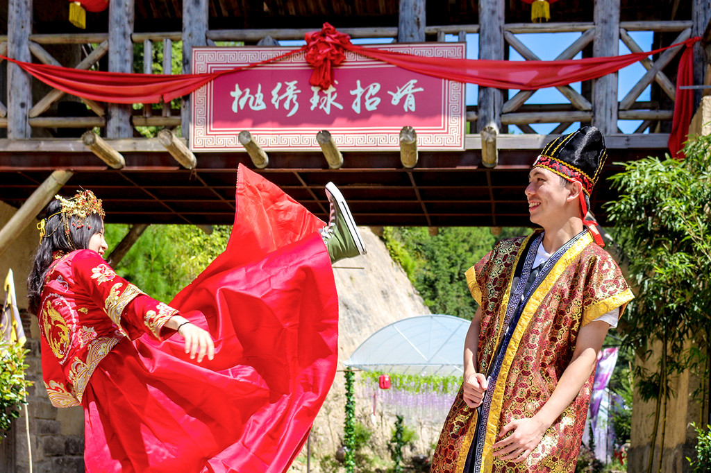 眼前的这座楼就是“绣楼”,没想到刚进门就玩的这么大!两旁的鼓声告诉我们马上会有新一轮的抛绣球。这绣球啊可不是一般人家抛的,说是这里的武林盟主给小女选夫君哦!身边的男性友人已经安耐不住了,牟足了劲我那个人群里挤!