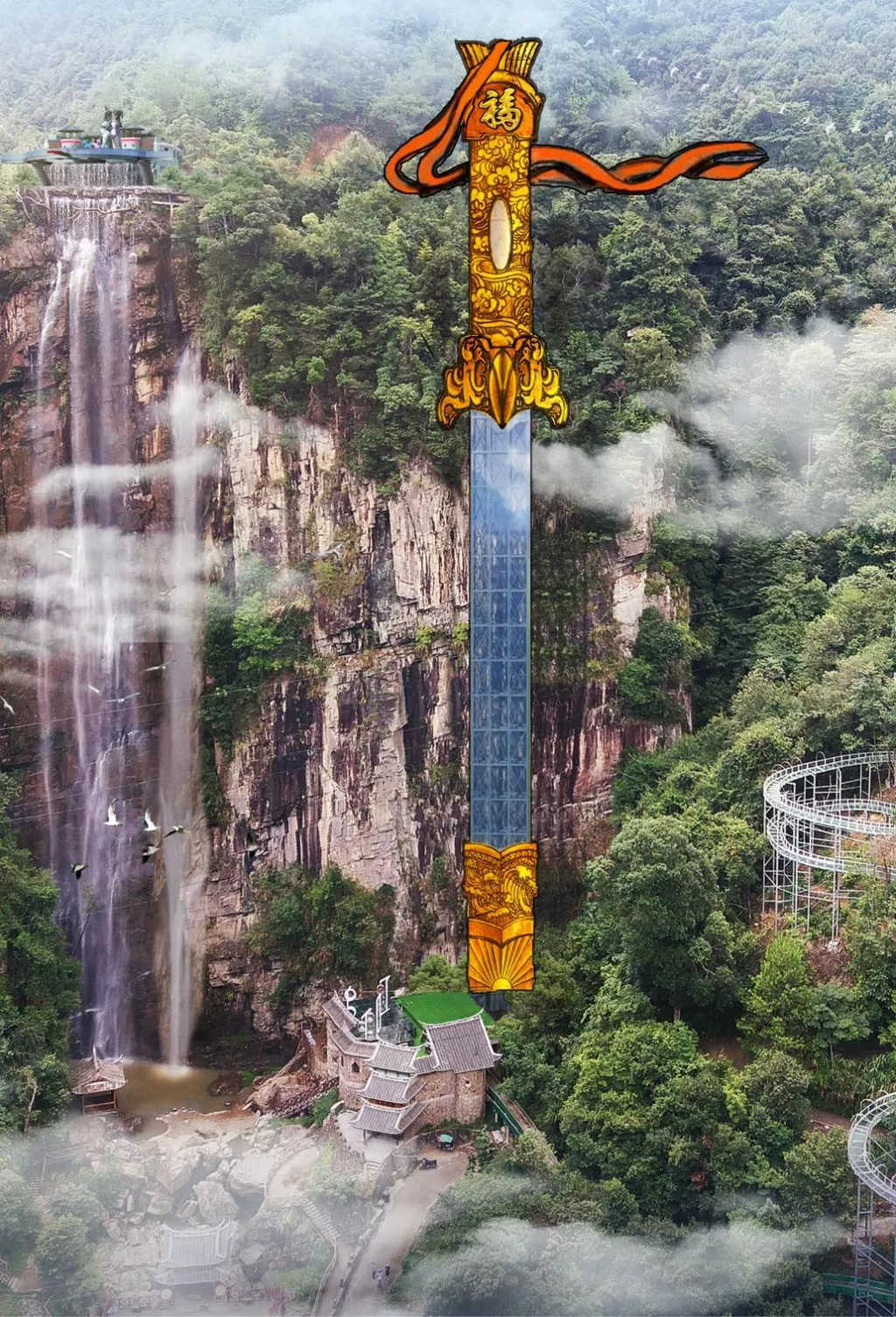 御剑飞行这绝对会成为一个爆火的打卡点!“中华神剑” — 江湖称霸,整座电梯依山势而建,矗立在百米的悬崖边,近观巧夺天工,远观气势如虹内置三部高速电梯,待“中华神剑”铸成之时,飞瀑流泉,御剑而行,不必爬过漫漫山路,便可望着无际的绝美山水,体会一把武林高手飞檐走壁的感觉