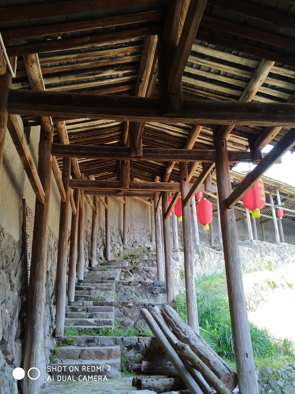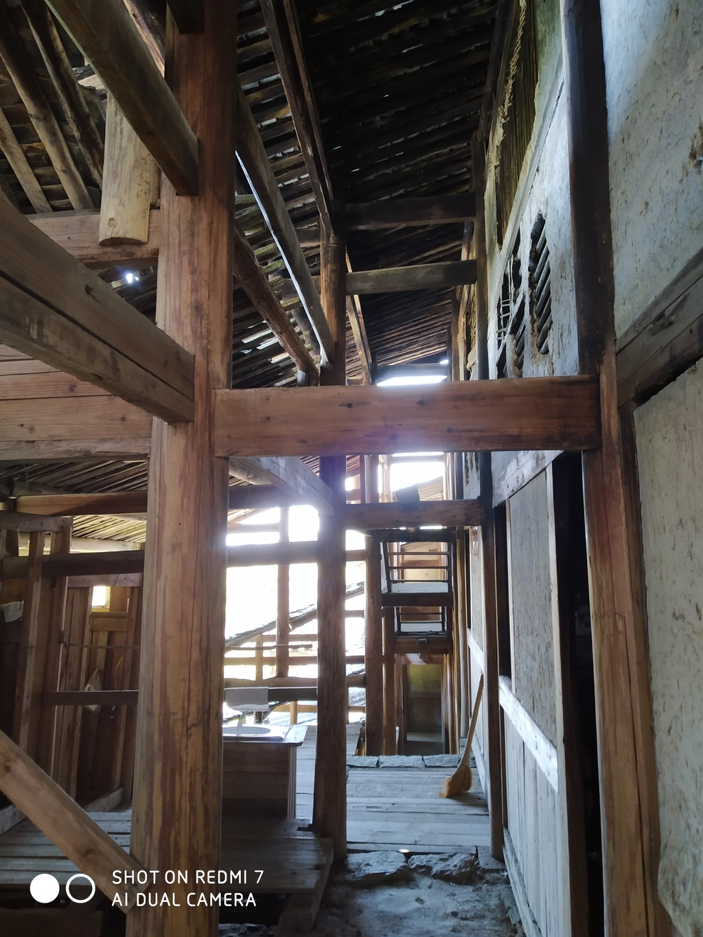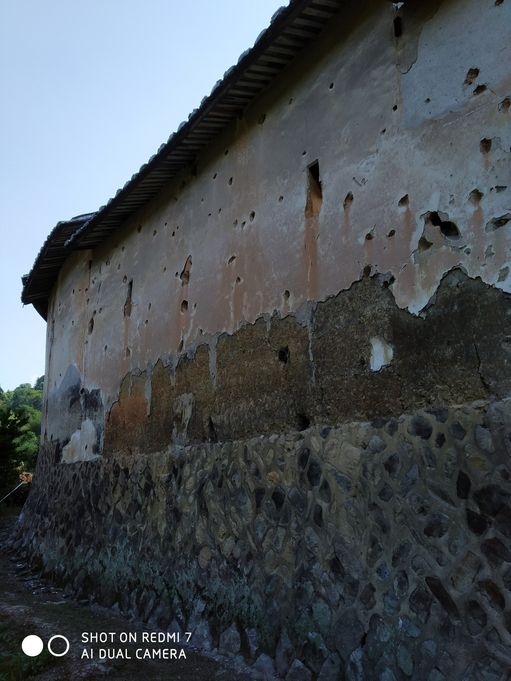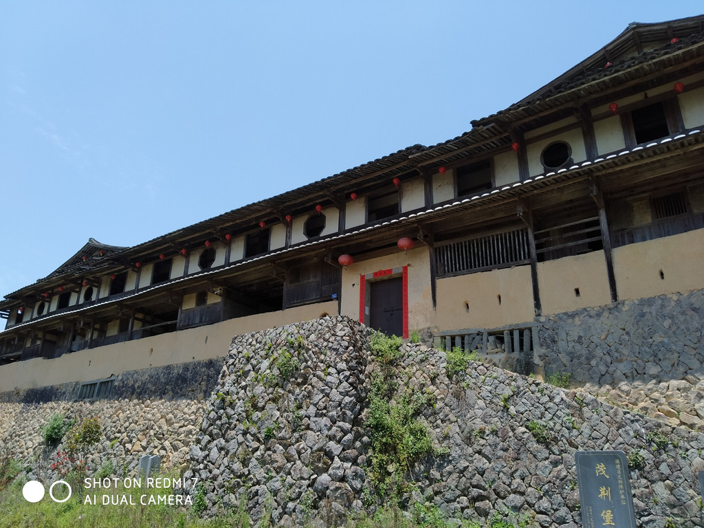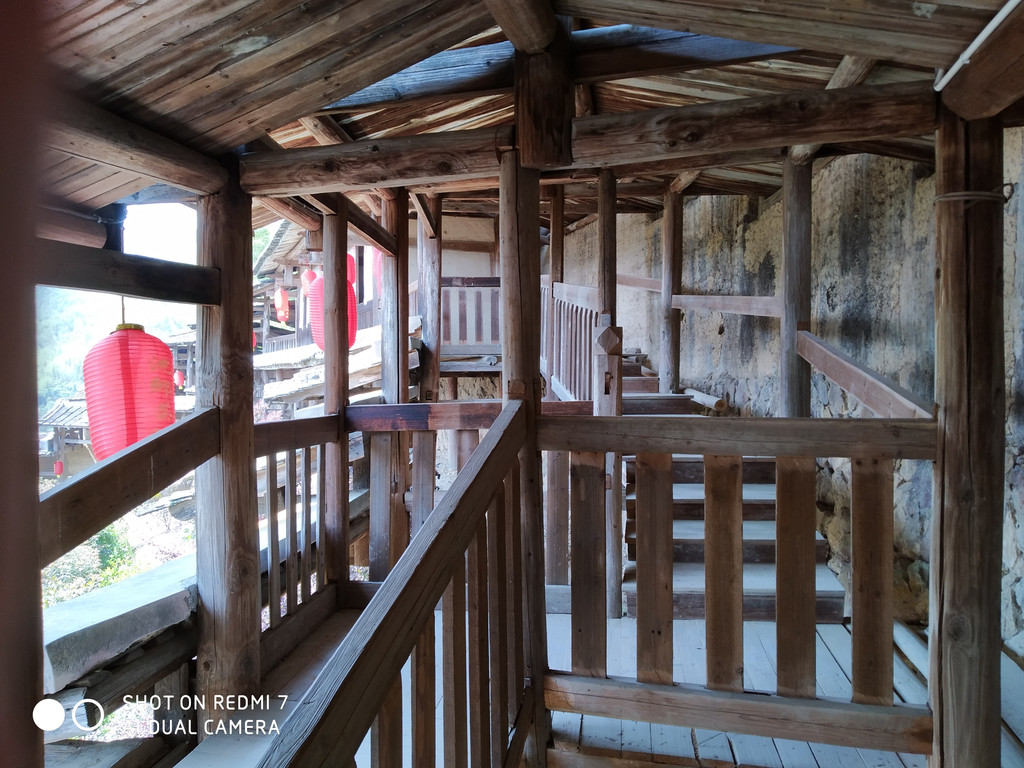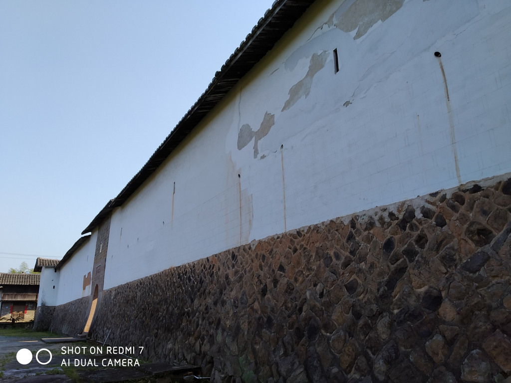 茂荆堡是尤溪县最美的土堡之一,依山面田,平面呈长方形,具有高台阶、高平台、高落差的特点,前后高差大于17米,超过绍安庄。全堡面阔105米,进深60米,共108间房,房间虽不算多,但面阔在此行所见的古堡中可能居第一,大门则用铁皮包裹,门上方有2个错位注水孔,当外敌入侵时可通过此孔倒下开水、滚油伤敌或注水灭火,堡墙高8.5米厚3米,其中墙基部分就有6米高,均用坚硬黑色的大块毛石垒砌而成,墙基上方土墙还加竹条做“钢筋”,以增加了安全性和坚固性。据说我们刚才经过的那块天然巨石,也是茂荆堡的报警器,放哨人在土匪来时可用急促的敲石声报警 ,此外堡内还设有逃生通道,发生突发事件时,族人可通过地道逃往后山躲避。民国时期,德化有个土匪听说茂荆堡陈氏家族家财万贯,便召集了200多个土匪,把土堡围了个水泄不通,可是攻打了十几天,用尽了土炮、鸟铳,始终无法攻入,反而被堡内的鸟铳、火、油损伤了几十人,最后无功而返,茂荆堡从此有了“铁宅”之名。我们登上高高的台阶,早有一正装老者等在门口,原来他是堡主的后人,今天主动充当导游带我们走一圈,最低一层的木阁楼下是架空层,左侧放置石舂等生活用具,右侧养牛,从两侧天井内的砌有的4级石台看,高差的确很大,这在福建古民居中应该是最高的,而跑马道的上山部分却是木梯,最上面正中部分又是悬空的吊脚楼,这在庄寨、古堡中还是第一次见到。