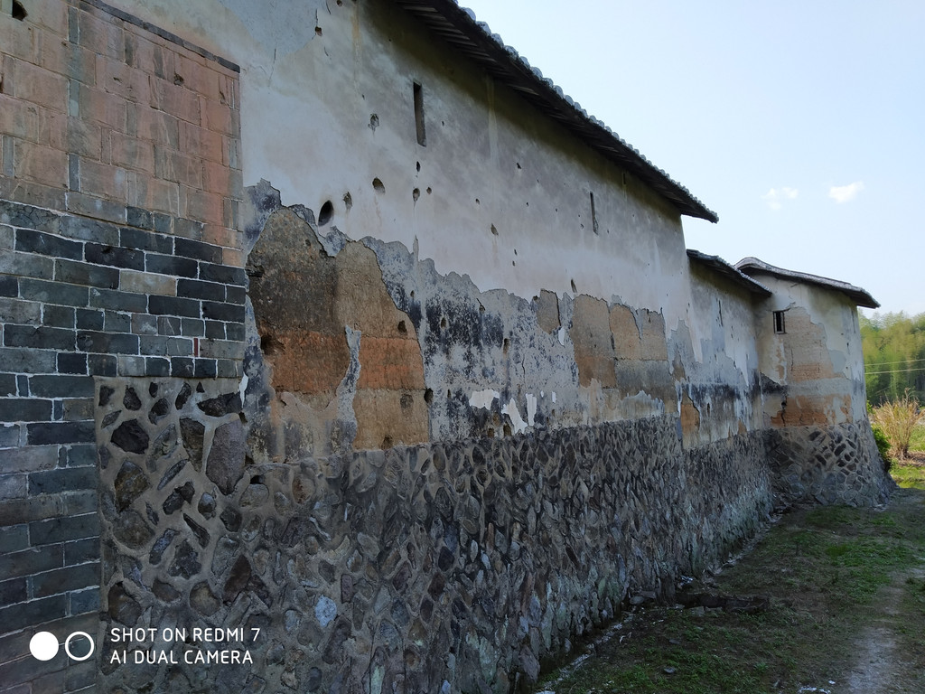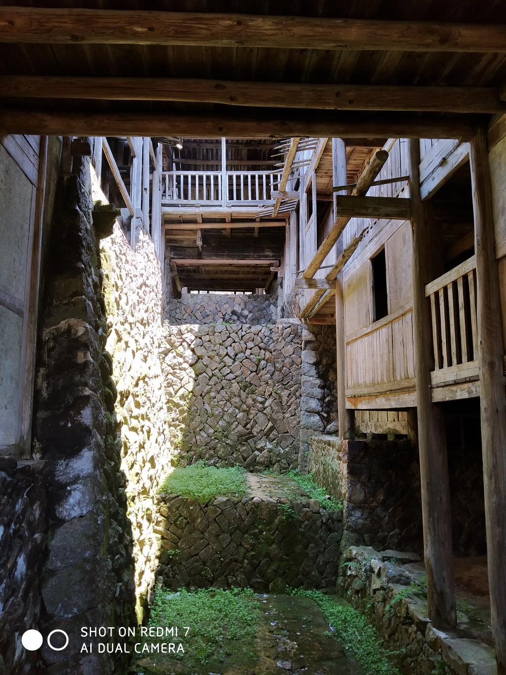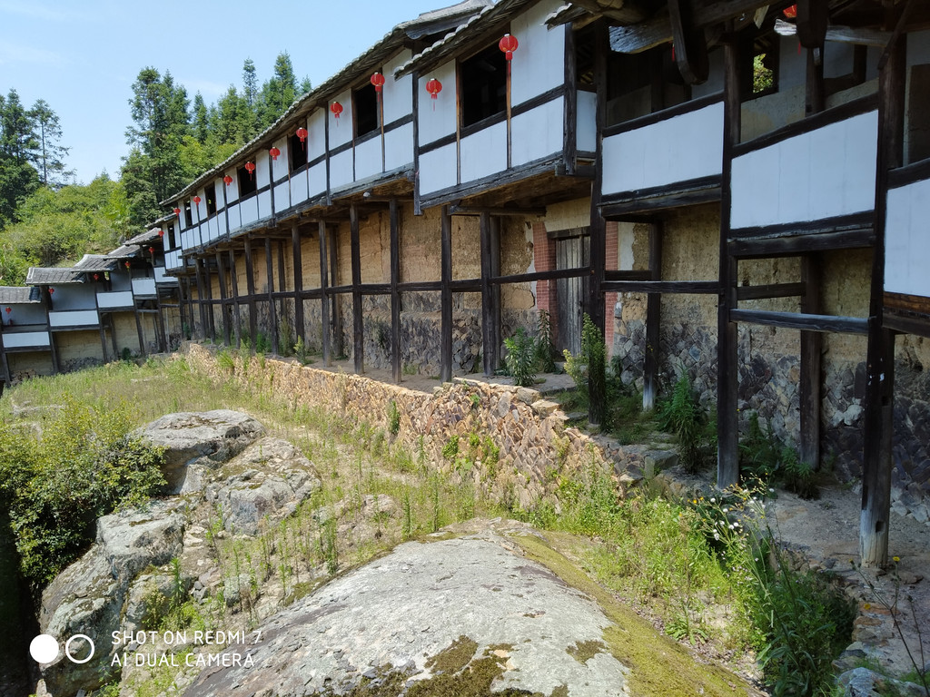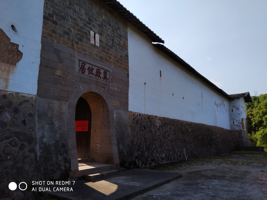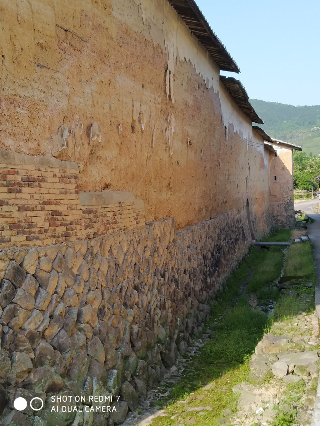 茂荆堡是尤溪县最美的土堡之一,依山面田,平面呈长方形,具有高台阶、高平台、高落差的特点,前后高差大于17米,超过绍安庄。全堡面阔105米,进深60米,共108间房,房间虽不算多,但面阔在此行所见的古堡中可能居第一,大门则用铁皮包裹,门上方有2个错位注水孔,当外敌入侵时可通过此孔倒下开水、滚油伤敌或注水灭火,堡墙高8.5米厚3米,其中墙基部分就有6米高,均用坚硬黑色的大块毛石垒砌而成,墙基上方土墙还加竹条做“钢筋”,以增加了安全性和坚固性。据说我们刚才经过的那块天然巨石,也是茂荆堡的报警器,放哨人在土匪来时可用急促的敲石声报警 ,此外堡内还设有逃生通道,发生突发事件时,族人可通过地道逃往后山躲避。民国时期,德化有个土匪听说茂荆堡陈氏家族家财万贯,便召集了200多个土匪,把土堡围了个水泄不通,可是攻打了十几天,用尽了土炮、鸟铳,始终无法攻入,反而被堡内的鸟铳、火、油损伤了几十人,最后无功而返,茂荆堡从此有了“铁宅”之名。我们登上高高的台阶,早有一正装老者等在门口,原来他是堡主的后人,今天主动充当导游带我们走一圈,最低一层的木阁楼下是架空层,左侧放置石舂等生活用具,右侧养牛,从两侧天井内的砌有的4级石台看,高差的确很大,这在福建古民居中应该是最高的,而跑马道的上山部分却是木梯,最上面正中部分又是悬空的吊脚楼,这在庄寨、古堡中还是第一次见到。