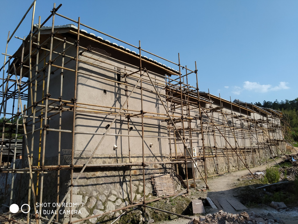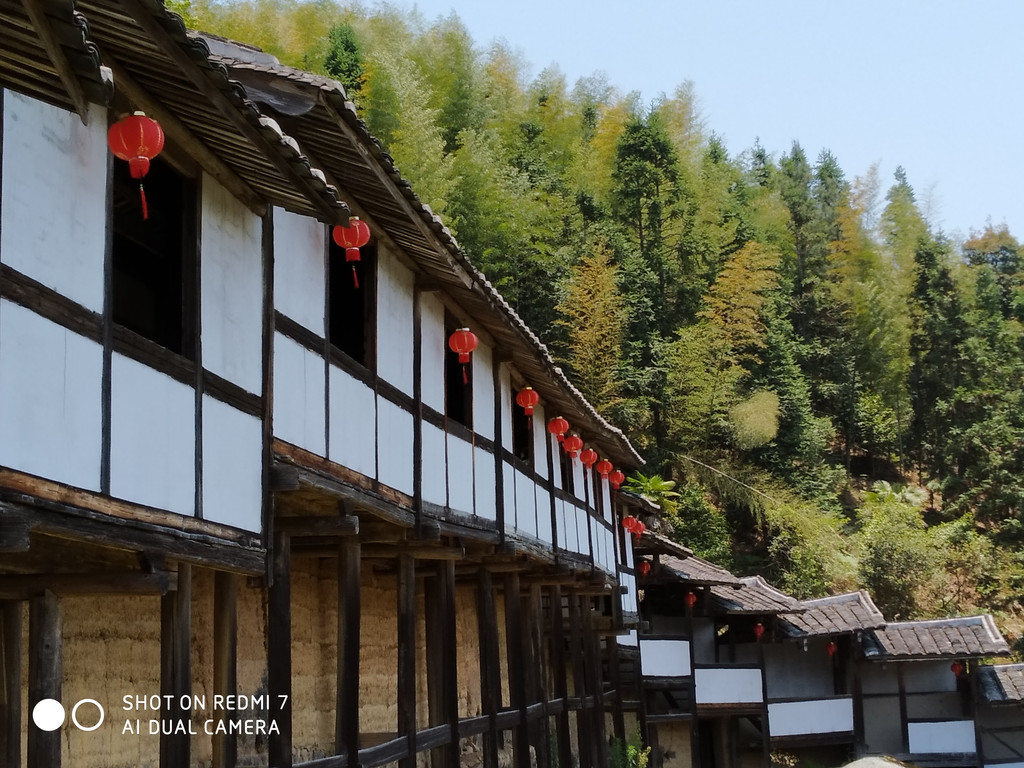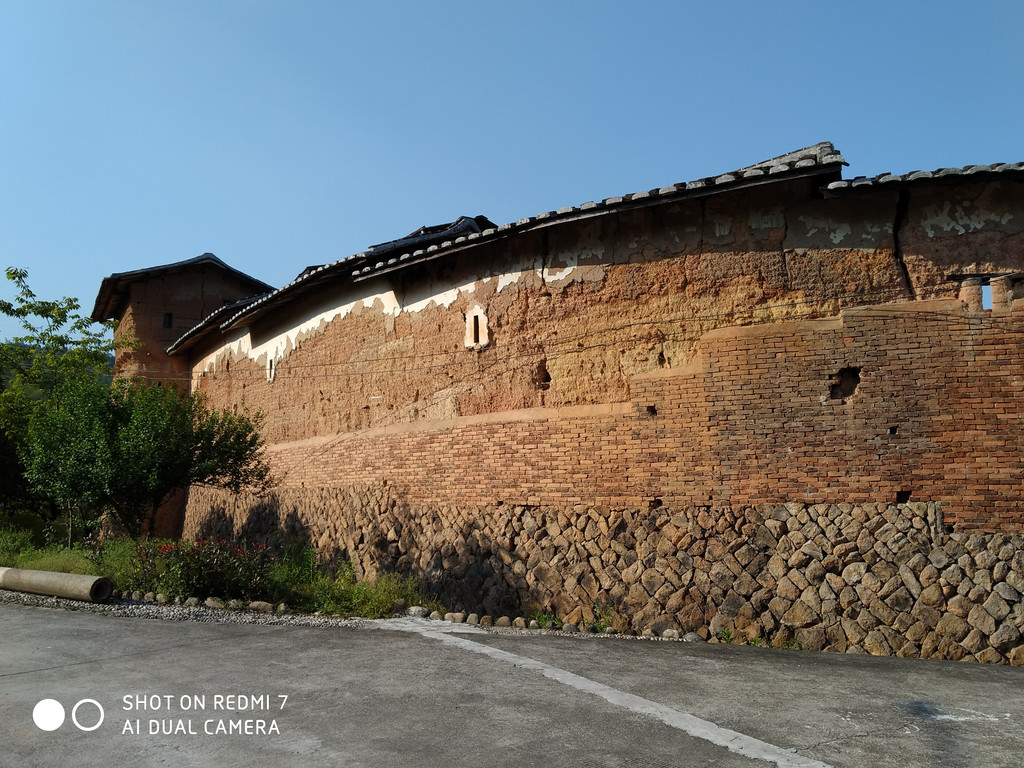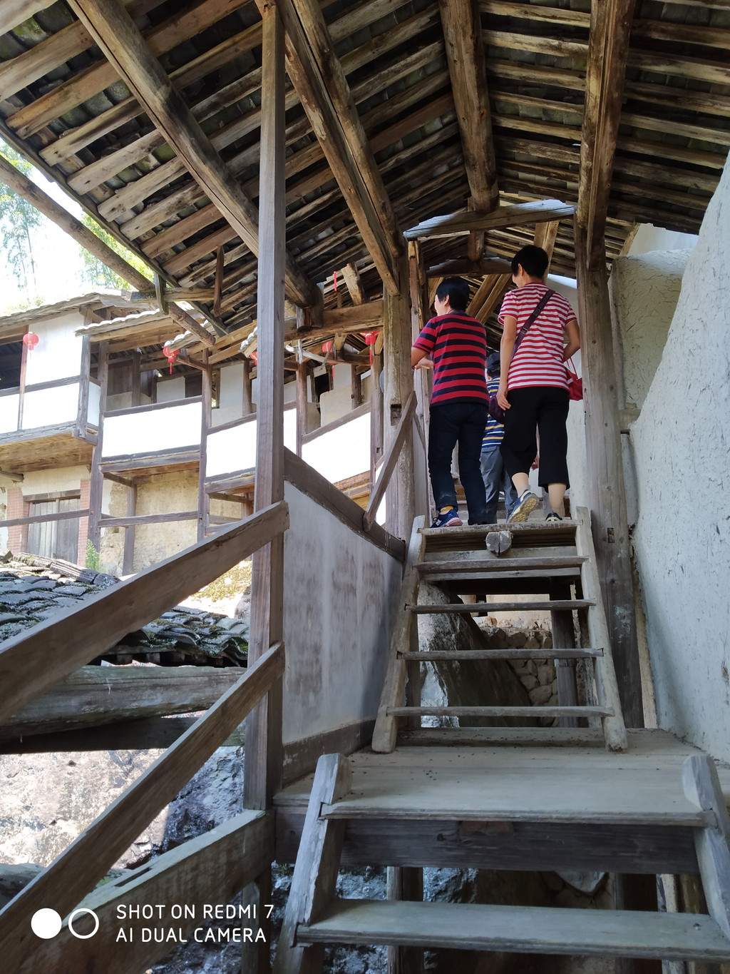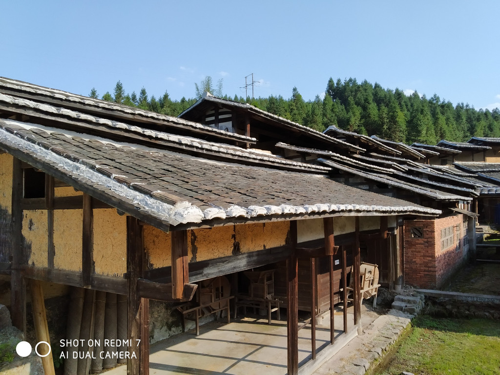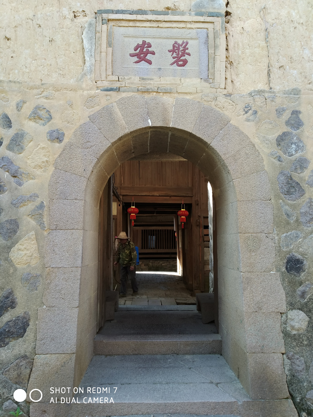 茂荆堡是尤溪县最美的土堡之一,依山面田,平面呈长方形,具有高台阶、高平台、高落差的特点,前后高差大于17米,超过绍安庄。全堡面阔105米,进深60米,共108间房,房间虽不算多,但面阔在此行所见的古堡中可能居第一,大门则用铁皮包裹,门上方有2个错位注水孔,当外敌入侵时可通过此孔倒下开水、滚油伤敌或注水灭火,堡墙高8.5米厚3米,其中墙基部分就有6米高,均用坚硬黑色的大块毛石垒砌而成,墙基上方土墙还加竹条做“钢筋”,以增加了安全性和坚固性。据说我们刚才经过的那块天然巨石,也是茂荆堡的报警器,放哨人在土匪来时可用急促的敲石声报警 ,此外堡内还设有逃生通道,发生突发事件时,族人可通过地道逃往后山躲避。民国时期,德化有个土匪听说茂荆堡陈氏家族家财万贯,便召集了200多个土匪,把土堡围了个水泄不通,可是攻打了十几天,用尽了土炮、鸟铳,始终无法攻入,反而被堡内的鸟铳、火、油损伤了几十人,最后无功而返,茂荆堡从此有了“铁宅”之名。我们登上高高的台阶,早有一正装老者等在门口,原来他是堡主的后人,今天主动充当导游带我们走一圈,最低一层的木阁楼下是架空层,左侧放置石舂等生活用具,右侧养牛,从两侧天井内的砌有的4级石台看,高差的确很大,这在福建古民居中应该是最高的,而跑马道的上山部分却是木梯,最上面正中部分又是悬空的吊脚楼,这在庄寨、古堡中还是第一次见到。