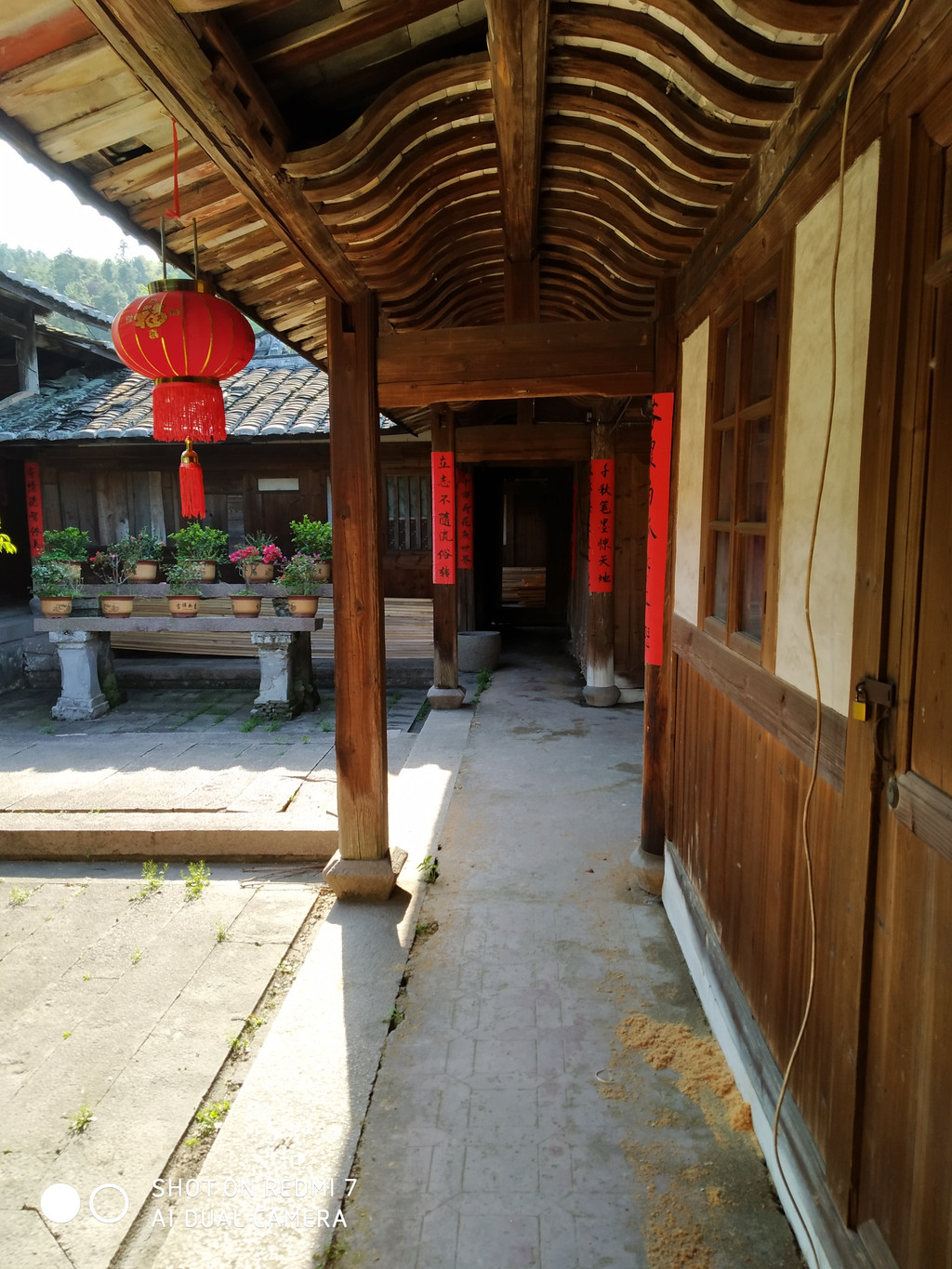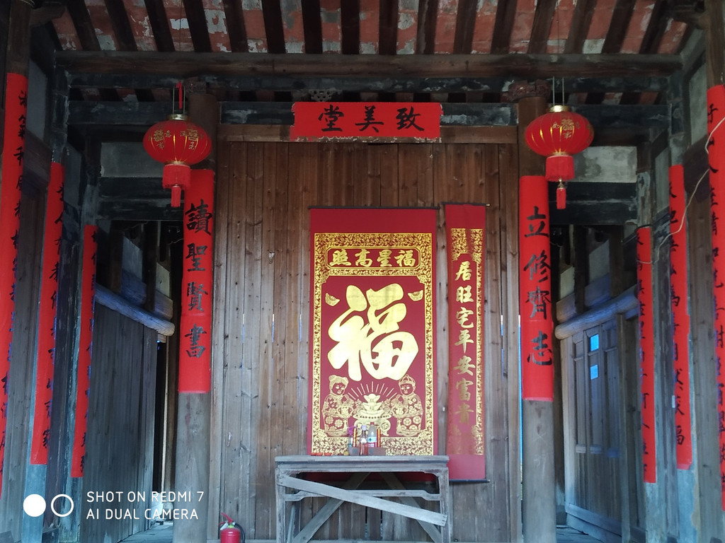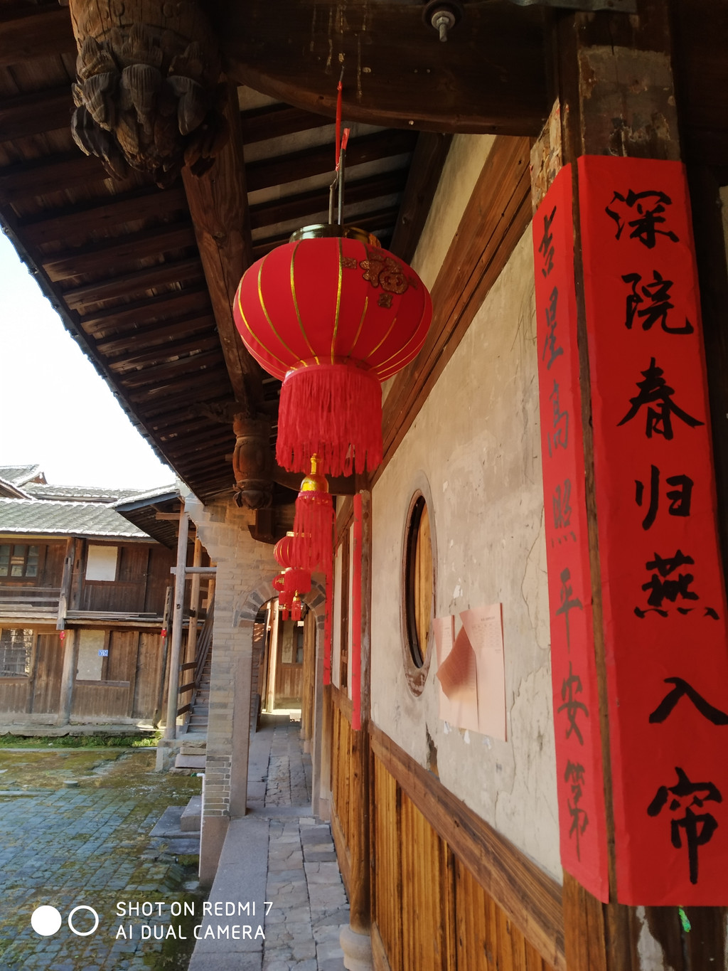 在双吉堡所在山坡的背面还有一座更大的双元堡,这是水美古堡群中的第3座,从西偏门进入正厅,我们在永泰嘉禄庄里看到的木雕“立修齐志”、“读圣贤书”8字,到这里成为一副对联,上方是“慎修堂”3个字。堡内为3进2横格局,每进之间均有马巷连通,整体构成9井13厅,堂上、院内都比较整洁,到处是红彤彤的灯笼、春联,装饰艺术与前二堡比又有不同,讲究雕梁画栋,无论是木雕、石雕、壁画,还是柱础石雕、天井花台架装饰等,均十分精致讲究,堡内板石为阶,地面均采用青砖铺面,厅堂等地面更是讲究花格式样,正屋门两侧墙上还设有两个圆窗,也许正应堡名“双元”之意,让人无不赏心悦目,感叹主人丰厚的财力和审美追求。