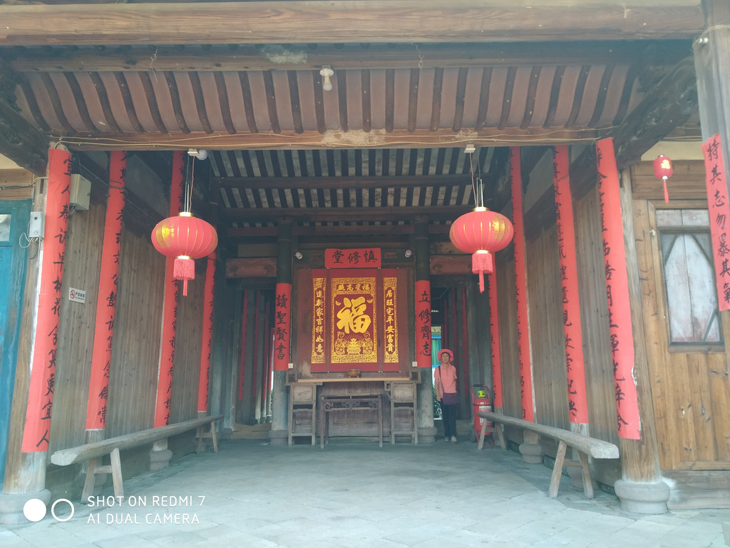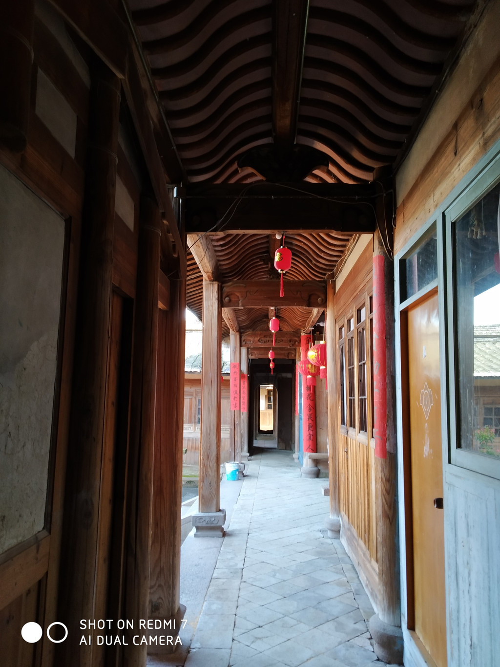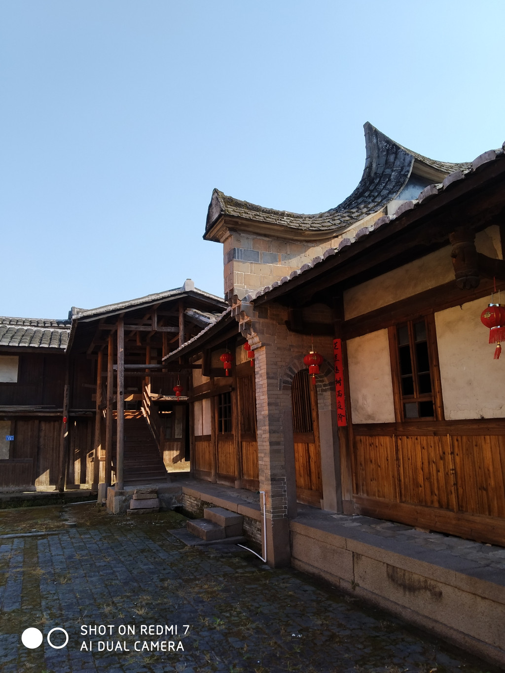 在双吉堡所在山坡的背面还有一座更大的双元堡,这是水美古堡群中的第3座,从西偏门进入正厅,我们在永泰嘉禄庄里看到的木雕“立修齐志”、“读圣贤书”8字,到这里成为一副对联,上方是“慎修堂”3个字。堡内为3进2横格局,每进之间均有马巷连通,整体构成9井13厅,堂上、院内都比较整洁,到处是红彤彤的灯笼、春联,装饰艺术与前二堡比又有不同,讲究雕梁画栋,无论是木雕、石雕、壁画,还是柱础石雕、天井花台架装饰等,均十分精致讲究,堡内板石为阶,地面均采用青砖铺面,厅堂等地面更是讲究花格式样,正屋门两侧墙上还设有两个圆窗,也许正应堡名“双元”之意,让人无不赏心悦目,感叹主人丰厚的财力和审美追求。