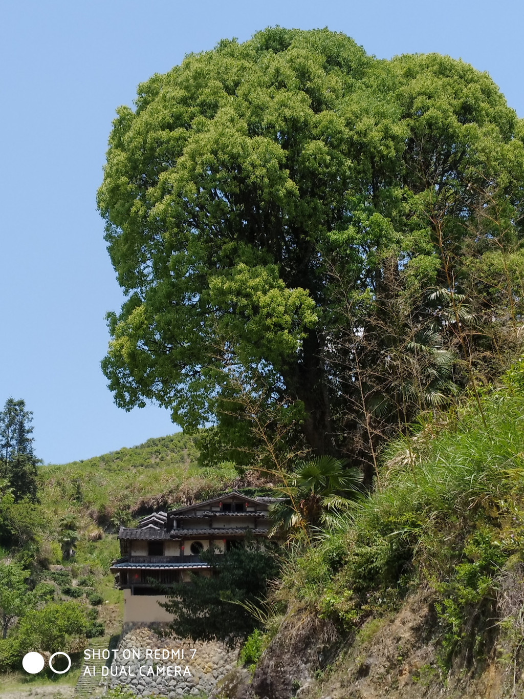 下山回到路口,穿过台溪乡街道后向深山进发,一路坡陡弯多,但翠竹满山,景色怡人,到盖竹村后左拐穿过一座木亭再左拐上行,路更窄了,坡更陡了,很快来到水泥路的尽头,迎面是一大幅的茂荆堡宣传照,接下来需要一小段的步行,正狐疑山穷水尽堡在何处时,前方一株参天古树下露出建筑一角,右拐过路口巨石后,茂荆堡全貌跃入眼帘,原来右边还有一片山岰,而且面对茂荆堡的山丘还是个很好的观景台,沿小路登上丘顶,看对面的茂荆堡视角最佳,全景尽收眼底,虽不似布达拉宫,但层次分明,气势非凡,这个观景台是茂荆堡的一大优势,其他古堡、庄寨并不具备这个条件。