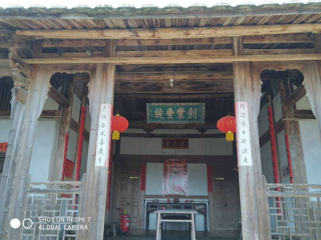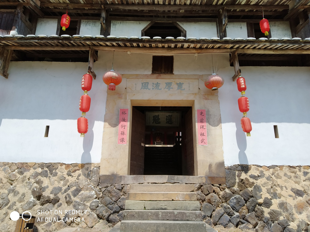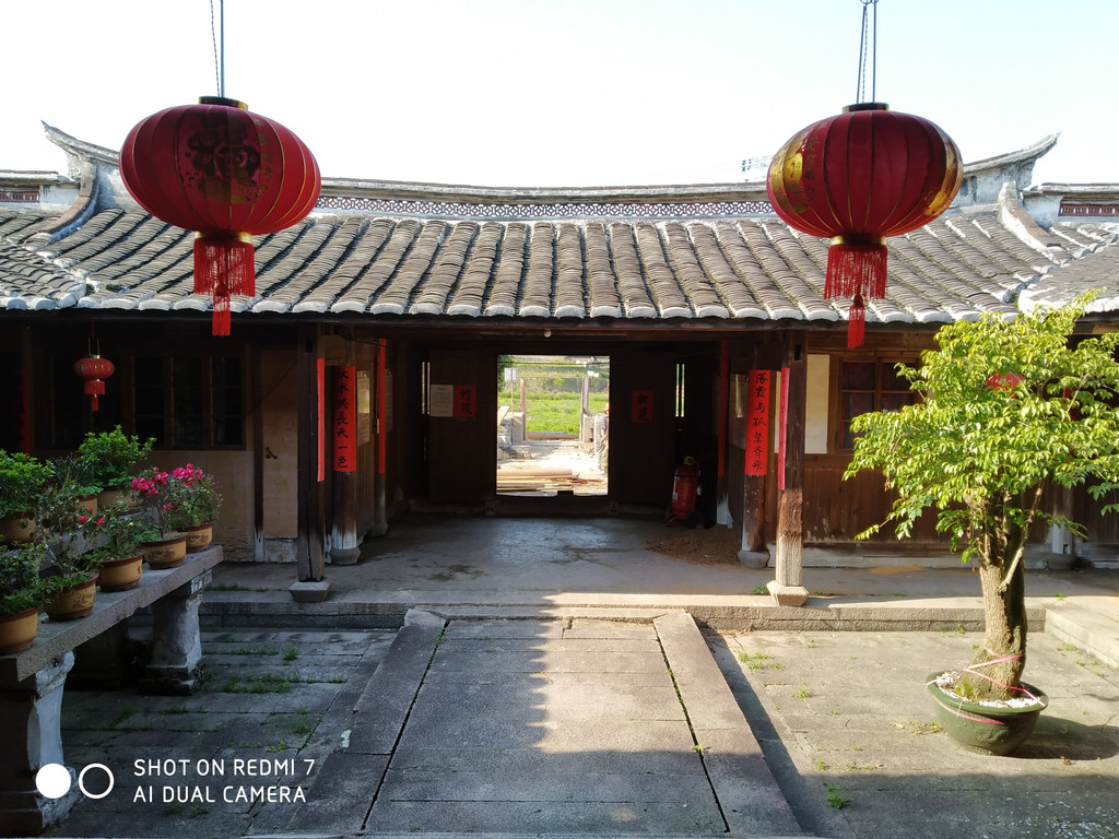 但左侧和中堂仍可参观,可见层层上升但坡度不大的阶梯式屋顶,堡内建筑亦为殿堂式,共二进,均为闽南式燕尾脊,翘角欲飞,前部设中堂,也是“立修齐志”、“读圣贤书”的对联,上方是“致美堂”3字,外面虽是工地,但门内、堂前却非常整洁干净,还有花木陈设点缀,很有情趣雅意。