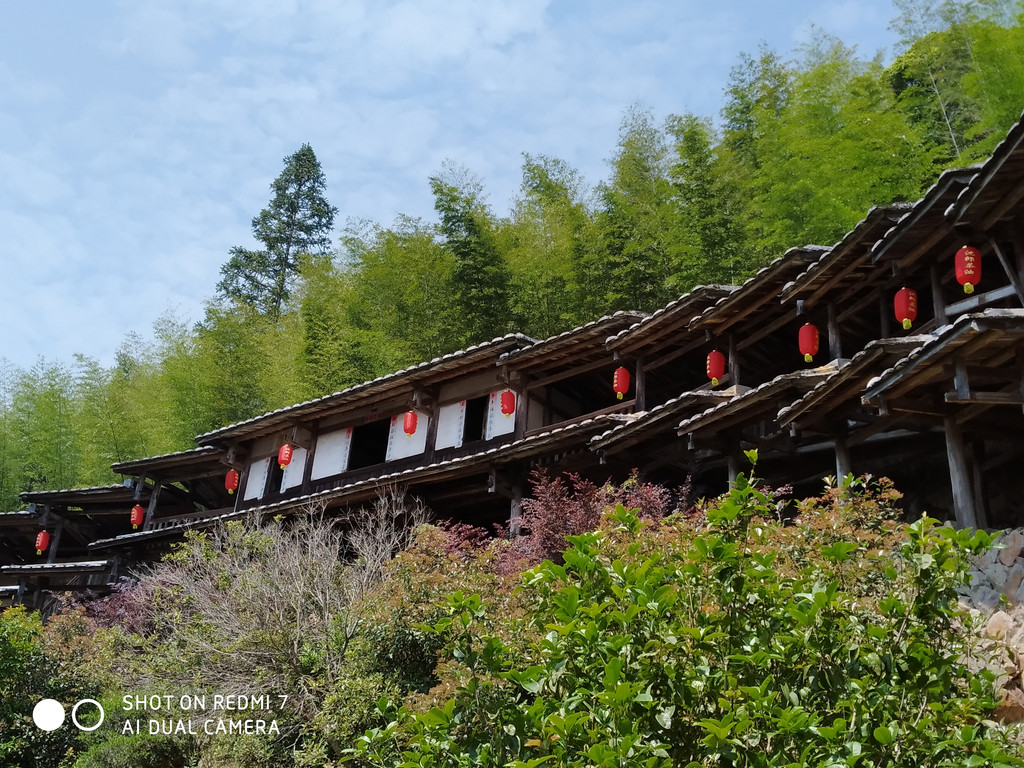 跑马道正中还有3个房间,向后山看还可见一段巡道,但大部已毁,山上是茂盛的竹林,在蓝天下摇曳多姿。