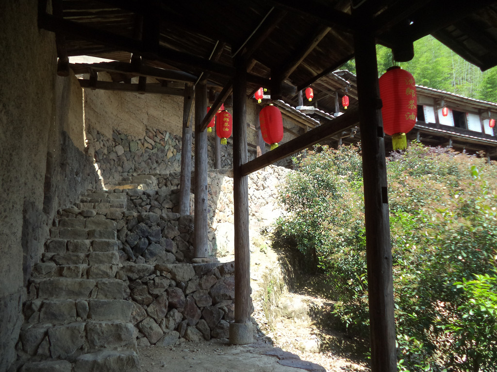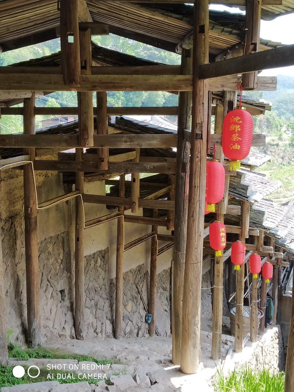 光裕堡后楼二层设“天六堂”和书房,一层专门存放柴草、粮食,后花台两侧靠厨房的地方有方形水井,可供全堡人饮用。从下往上看,石块堆砌成的台阶层层上升,蜿蜒环绕着整个侧廊,登上后花台来到侧廊的阶梯状跑马道,房檐下挂满红灯宠,上面均书有“沈郎茶油”字样,看来是商品广告,沈郎是朱熹的乳名,竟被注册为商标。