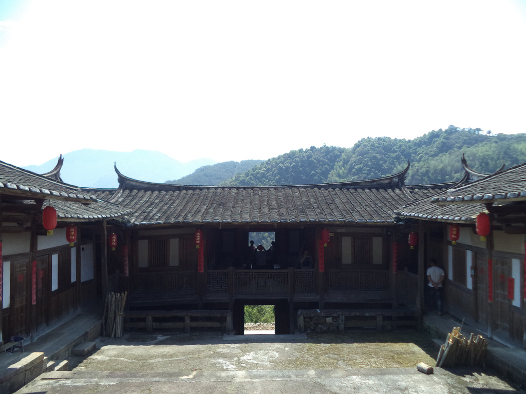 大门上没有堡名,而是镌刻着“奠厥攸居”4个大字,经查语出《尚书·盘庚》,意为“奠居正位,定民之居”,后面的落款是“同治元年立”(即公元1861年),这应是双吉堡建设年代。水美三堡的建筑格局与永泰庄寨略有差异,如走马道内侧还有附属房屋紧贴,且与正中的主堂并不相连,大门内都设有一大片宽敞的空坪,双元堡的后墙正中还建有一座角楼,这在永泰庄寨和三明古堡中可能是个孤例。