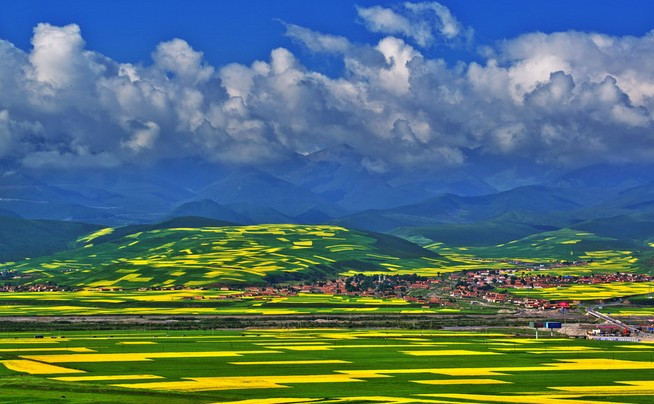 那大片大片的油菜花海,像望不到边的地毯,一直延伸到天的尽头。色彩如此明媚斑斓,像画家笔下的调色板一样,描绘在祖国的山川大地之间。我爱这种无边的美,仿佛可以描画出那种壮观倾世之美。是一种视觉的冲击和渲染。世间的给予,爱的祈求。统统都在这一刻释放!
