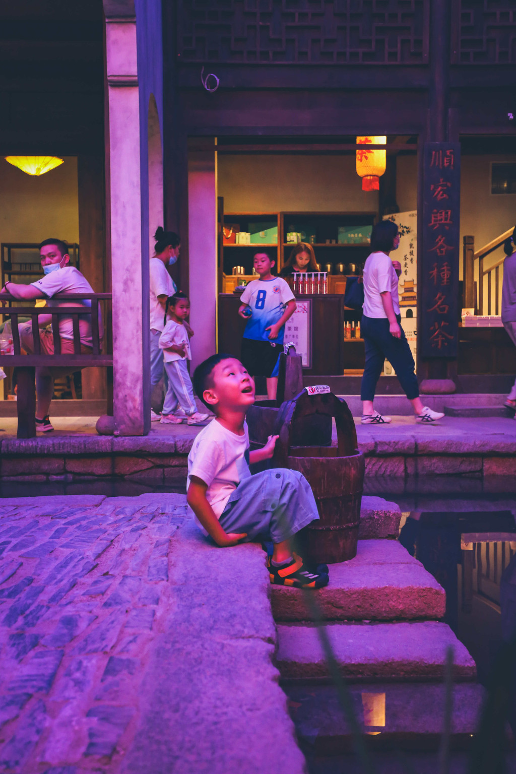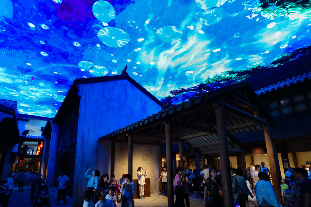 3号馆“因运而生”——大运河街肆印象,再现了运河时期沿岸的繁荣市井生活,可以穿汉服摆拍,这里是非常出片的,但是游客也是最多的,天空和两侧还有led屏幕,多维度互动体验式参观,屋顶还会下雨,是真的水,而且灯光相对较暗,所以带娃走路要当心。