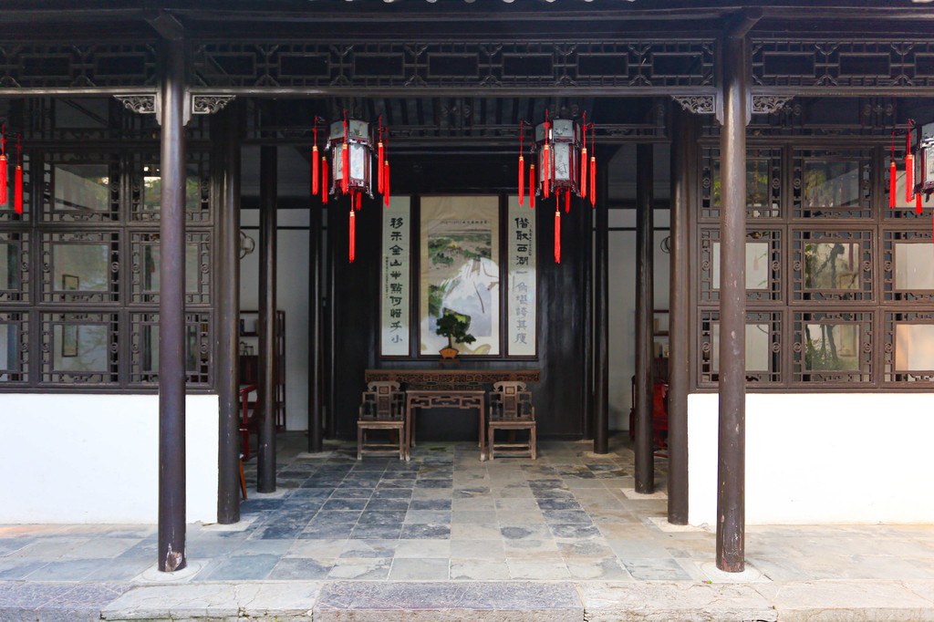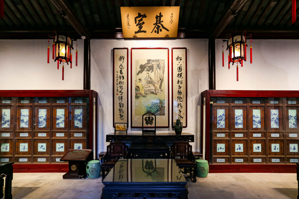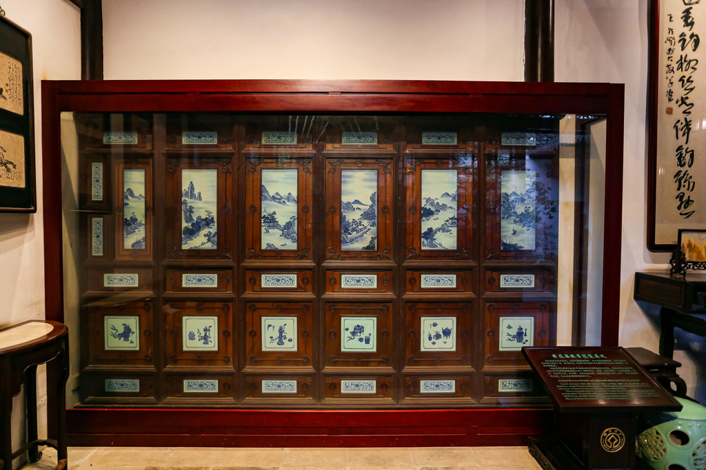 一旁的12片黄花梨嵌青花瓷屏风,是清乾隆年间的遗物,瓷板画以浓淡深浅的多重清华色调表现出山水人物的远近、疏密、层次分明,立体感极强,这也是瘦西湖的镇园之宝。