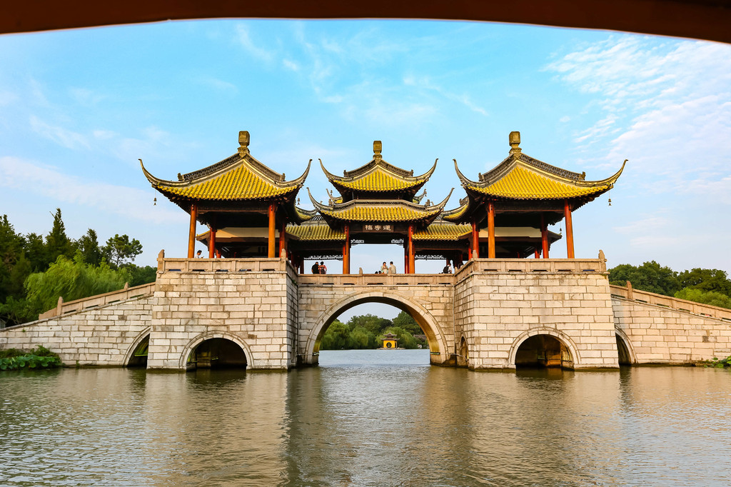 泛舟轻轻划过五亭桥,据说此桥建于乾隆二十二年(1757年),设计者是为了博取乾隆高兴,仿照北京北海的五龙亭和十七孔桥而建。