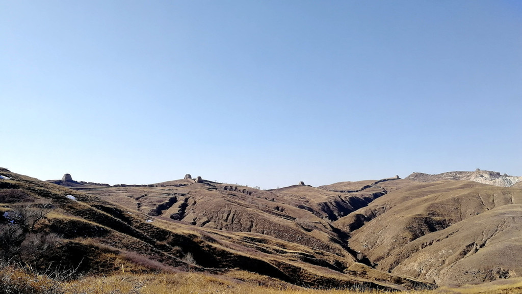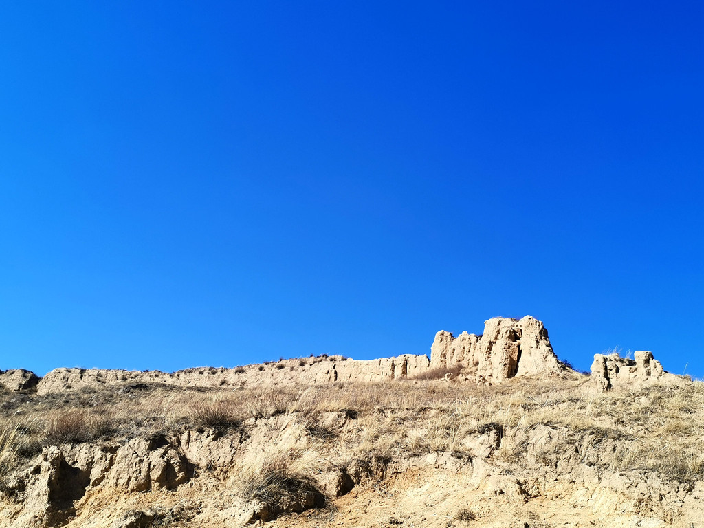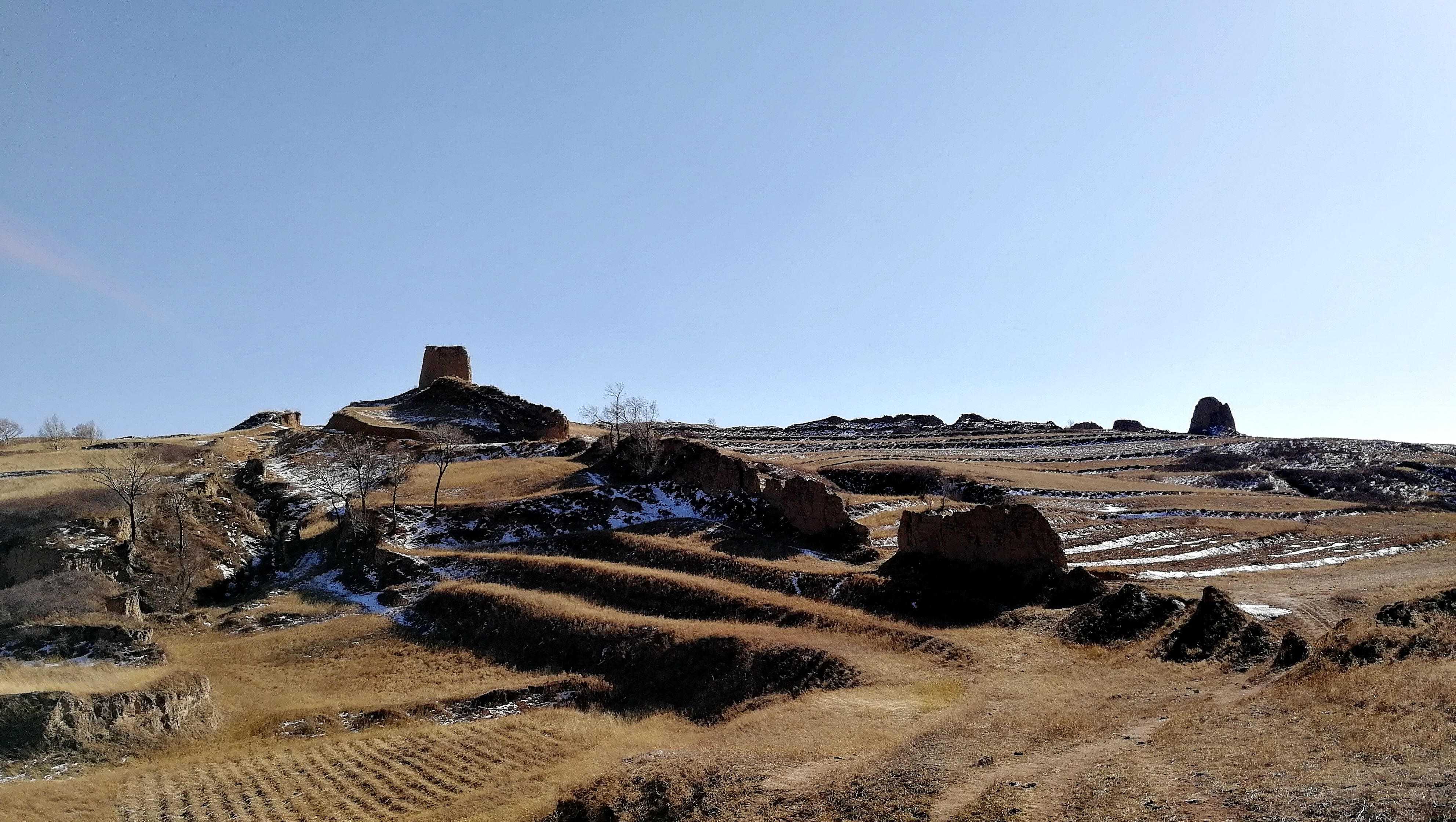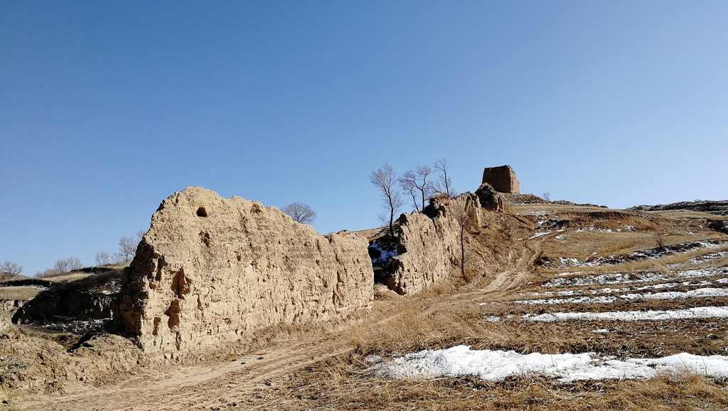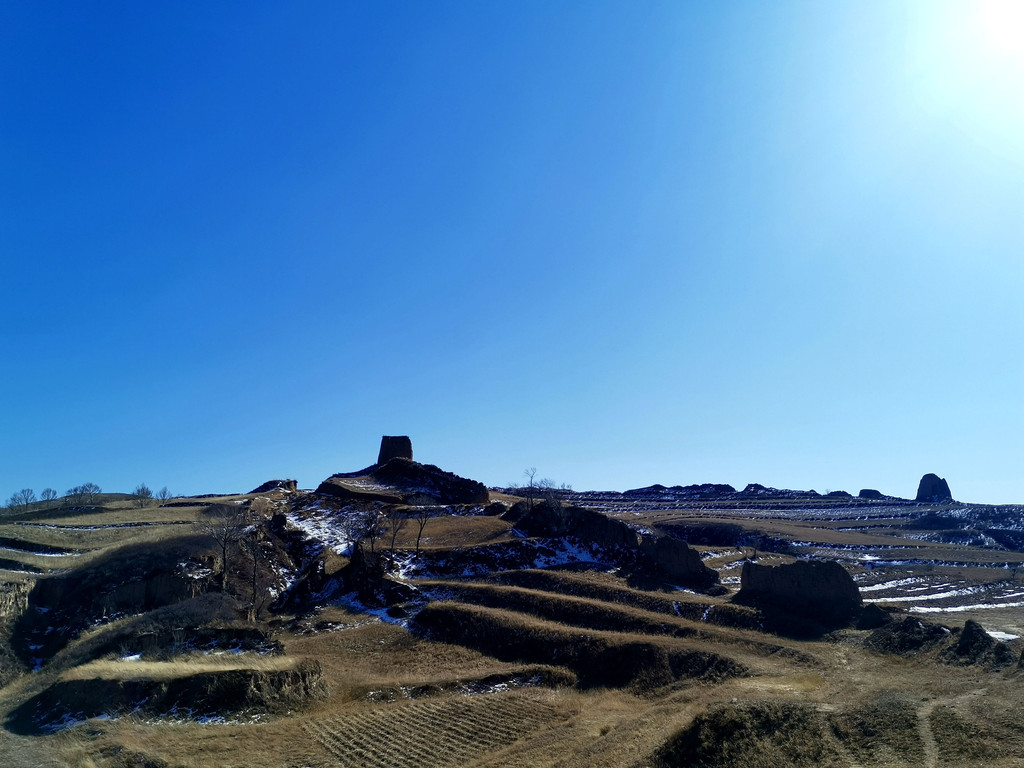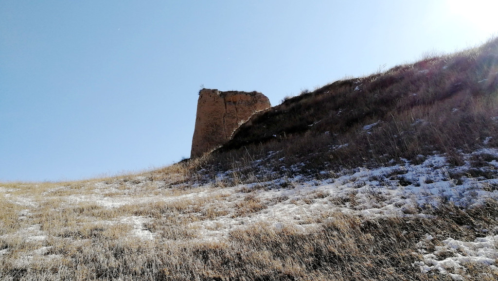 烽火台的背面还没来得及消融的残雪嵌于枯草丛中,更显苍穹。