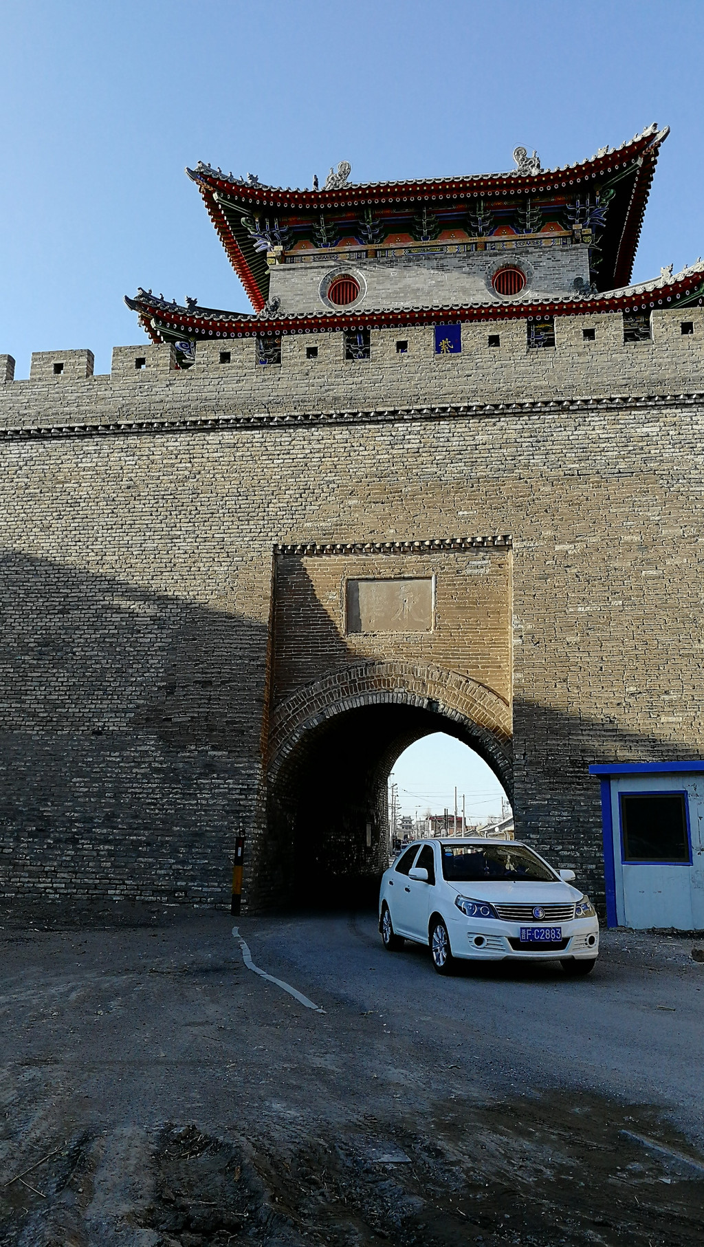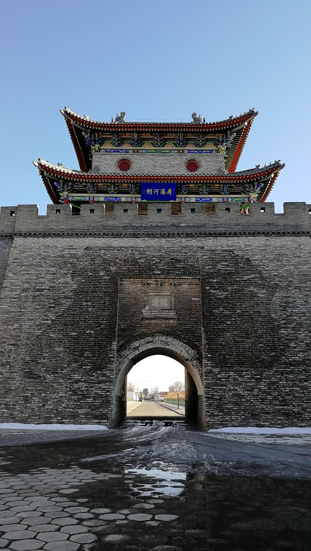 南北城门是用砖瓦翻新了的城门和瓮城,东西还是原貌。我们就是尾随一辆汽车从这个北门进入的。度娘介绍四门之北曰-镇朔,城楼挂木匾北曰-严疆锁鈅;可我拍到的是北门是“镇远”牌匾为“屏藩河朔”。不知是挂错了还是我理解有误,愿有知道的帮我解解,在此谢过!