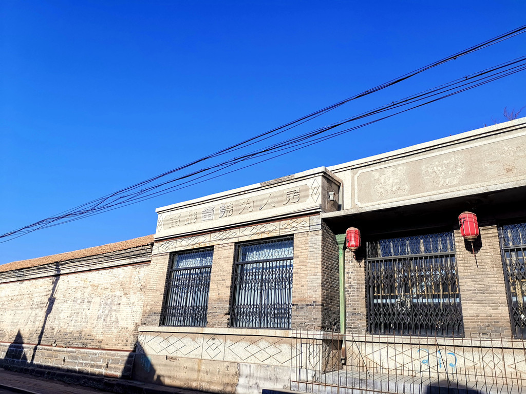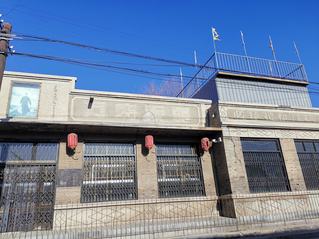 十字路北有一建筑现被保护起来,看着之前像是商业用途。毛主席画像镶嵌中央,左边题词应是“祝毛主席”,右边题词清晰可见“万寿无疆”。在题词左右两边又有不太押韵的两句话“备战备荒为人民”和“必须把粮食抓紧”。