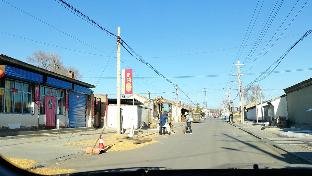 路边老乡正晾晒玉米。