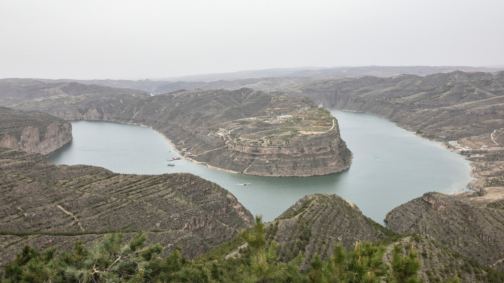 借用一张航拍图片,可以欣赏乾坤湾全貌,太极图案一览无余。黄河在此惊回首,转了一个不可思议的大弯,将黄土高坡围成一个半岛,留下令人惊叹的鬼斧神工之作。